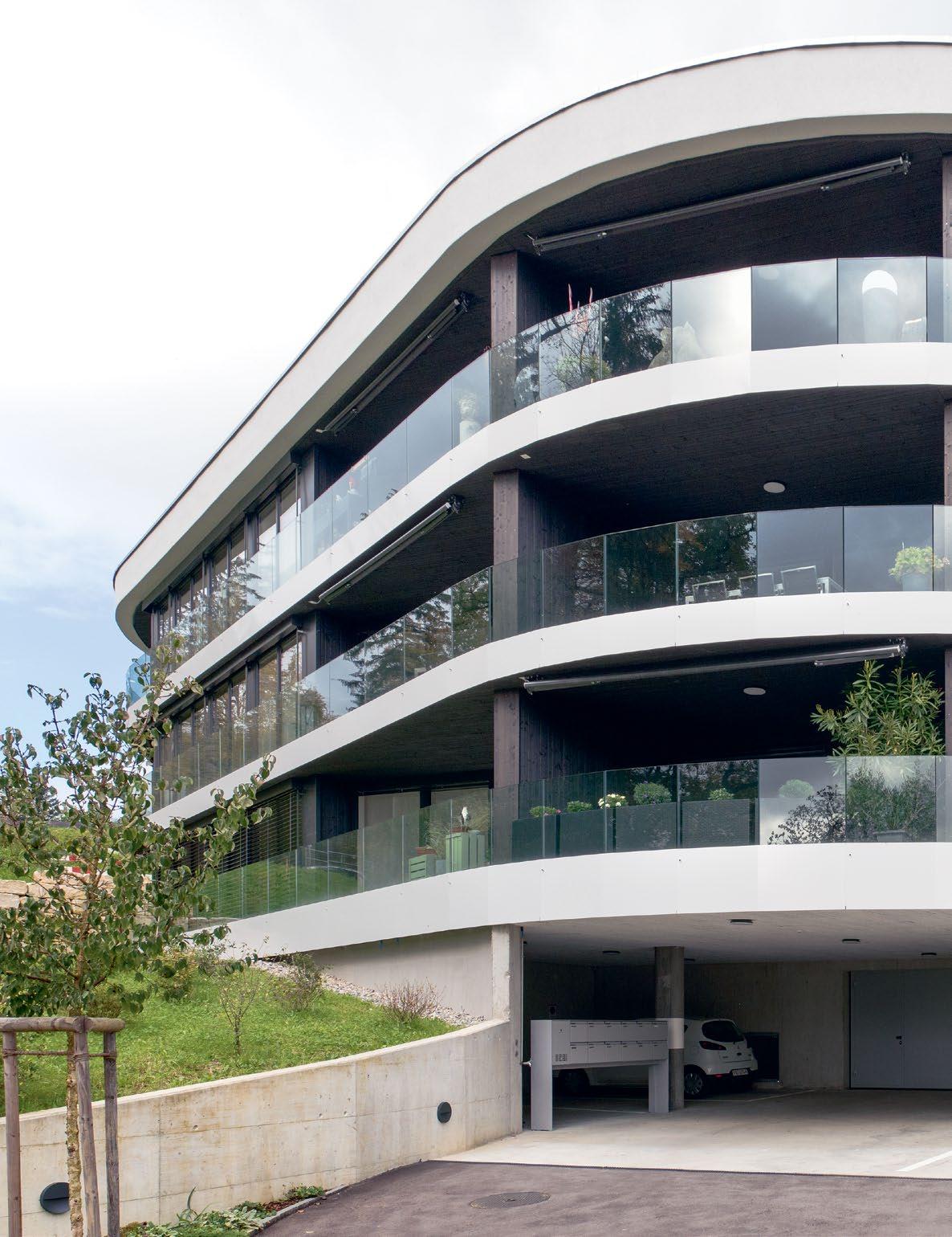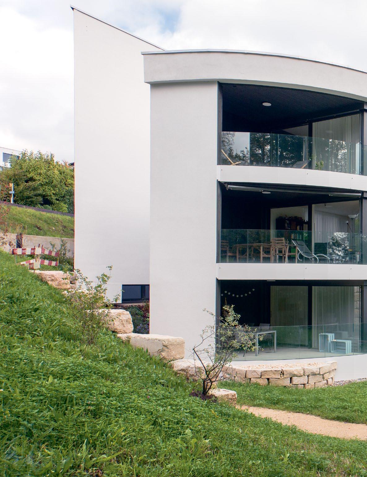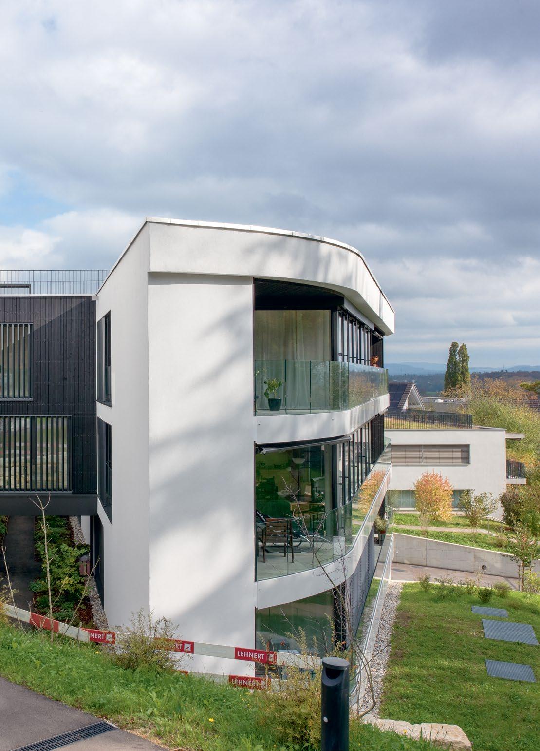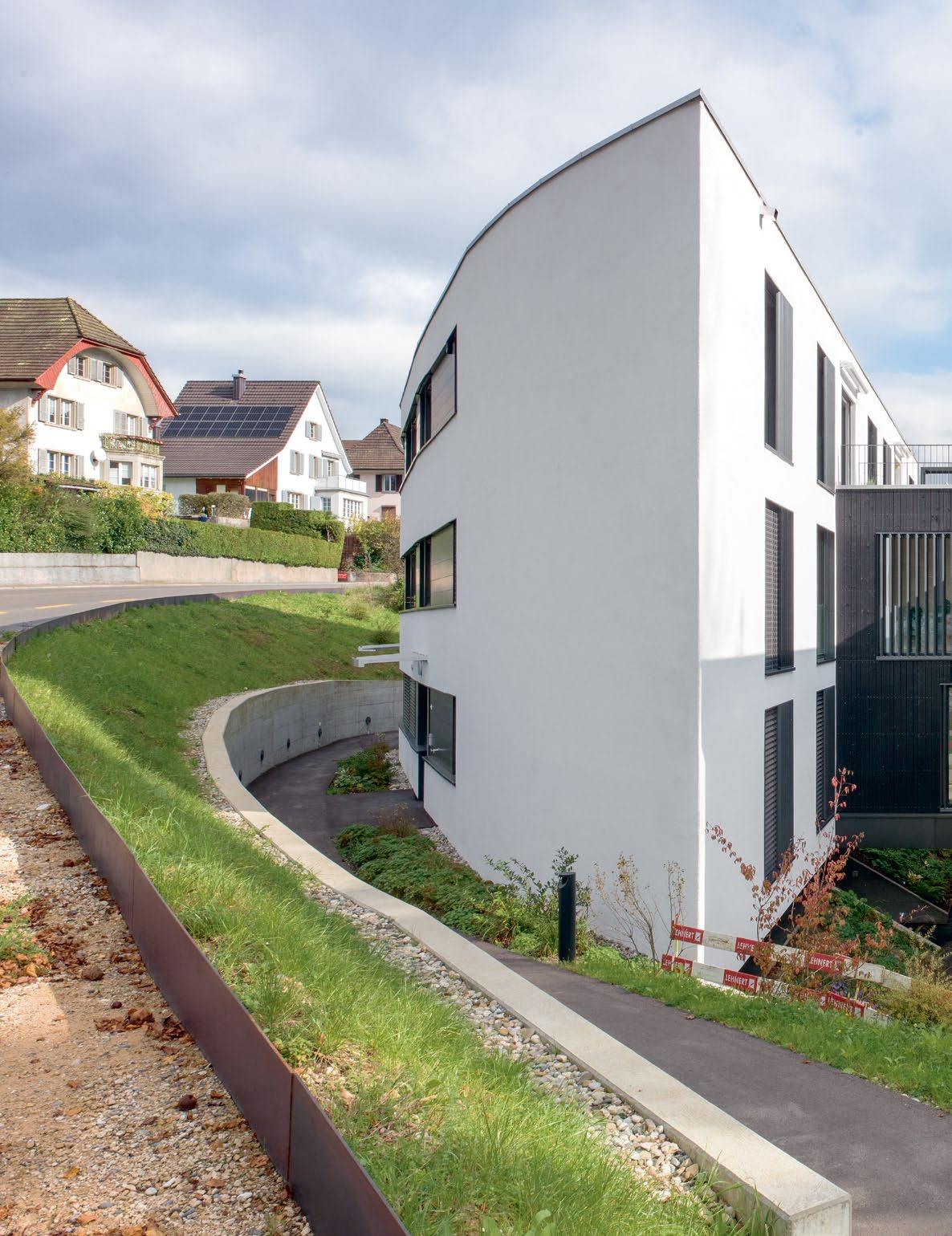 Auf die topografischen Gegebenheiten reagiert der Neubau geschickt, in dem er sich in der Höhe staffelt, dem natürlichen Gelände folgt und so den Grundstückscharakter zu wahren vermag. Zugleich entwickelt die Volumetrie, mit zur Parzelle passend gerundeter Grundform, eine prägnante Gesamterscheinung – und eine aussergewöhnliche, eigenwillige Wohnlandschaft. Die beiden voneinander losgelösten Baukörper, die einen schön bepflanzten Innenhof bilden, organisieren auf den insgesamt drei Wohngeschossen zwölf differenziert ausgestaltete 2.5- bis 4.5-Zimmer-Wohneinheiten: Diese sind entweder in einem der beiden Baukörper integriert oder bestehen aus zwei Teilen, die mittels Passerellen miteinander verbunden sind. Dieser dritte, mittige Baukörper bietet Blick auf den darunter liegenden Garten und funktioniert für die obersten Wohnungen als Balkon. Er hebt sich von den restlichen, nahtlos gerundeten und mit grosszügigen Fensteröffnungen versehenen Fassaden durch eine anders gewählte Materialisierung und Formgebung ab, was seine Atrium-Wirkung verstärkt und räumliche Tiefe schafft.
