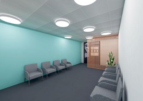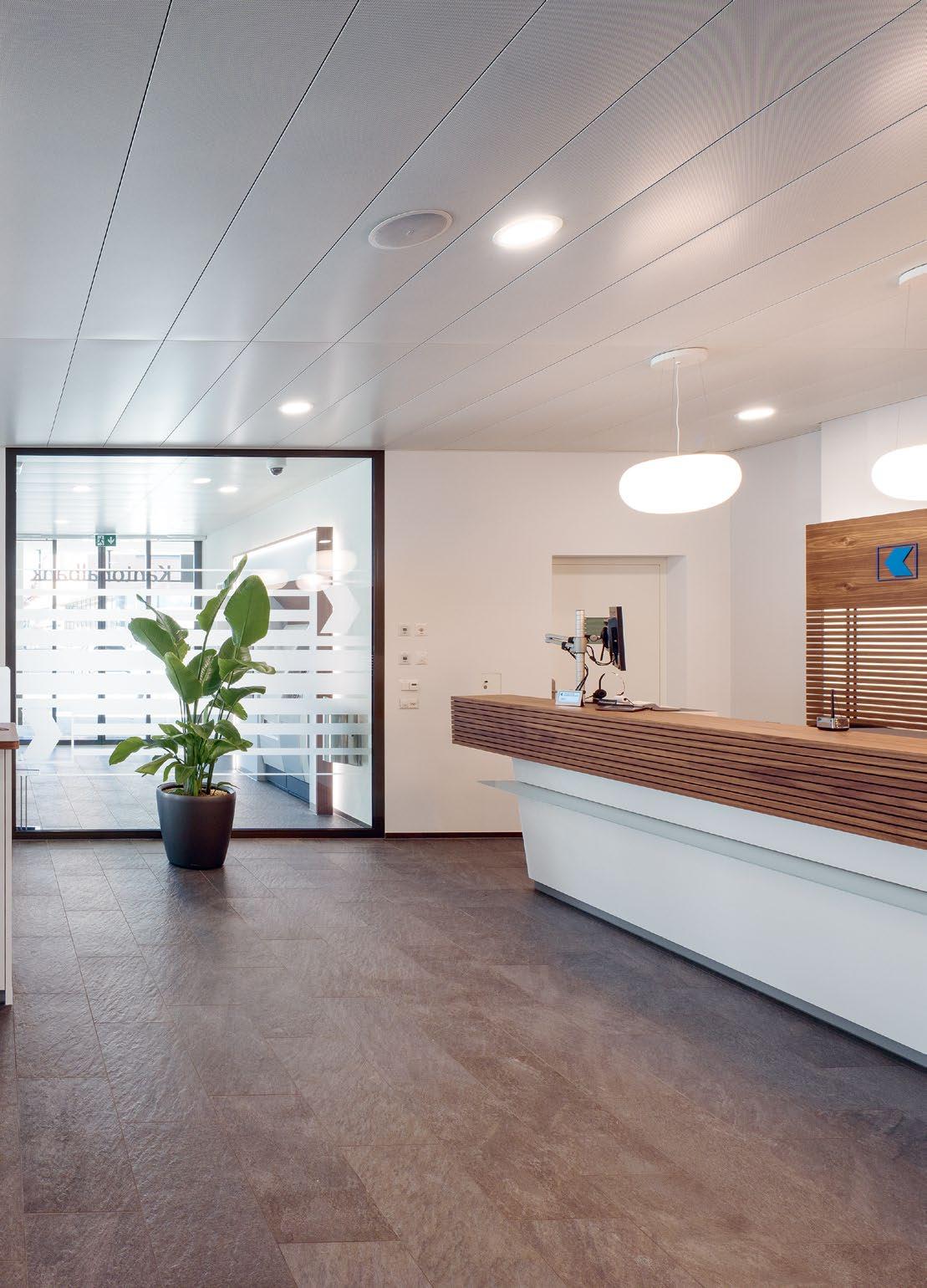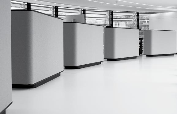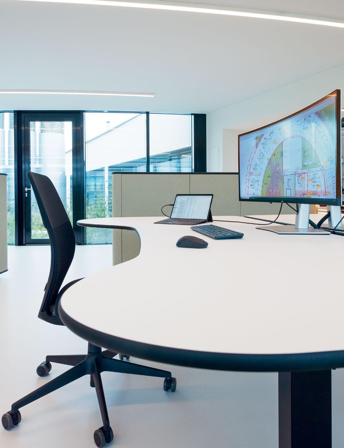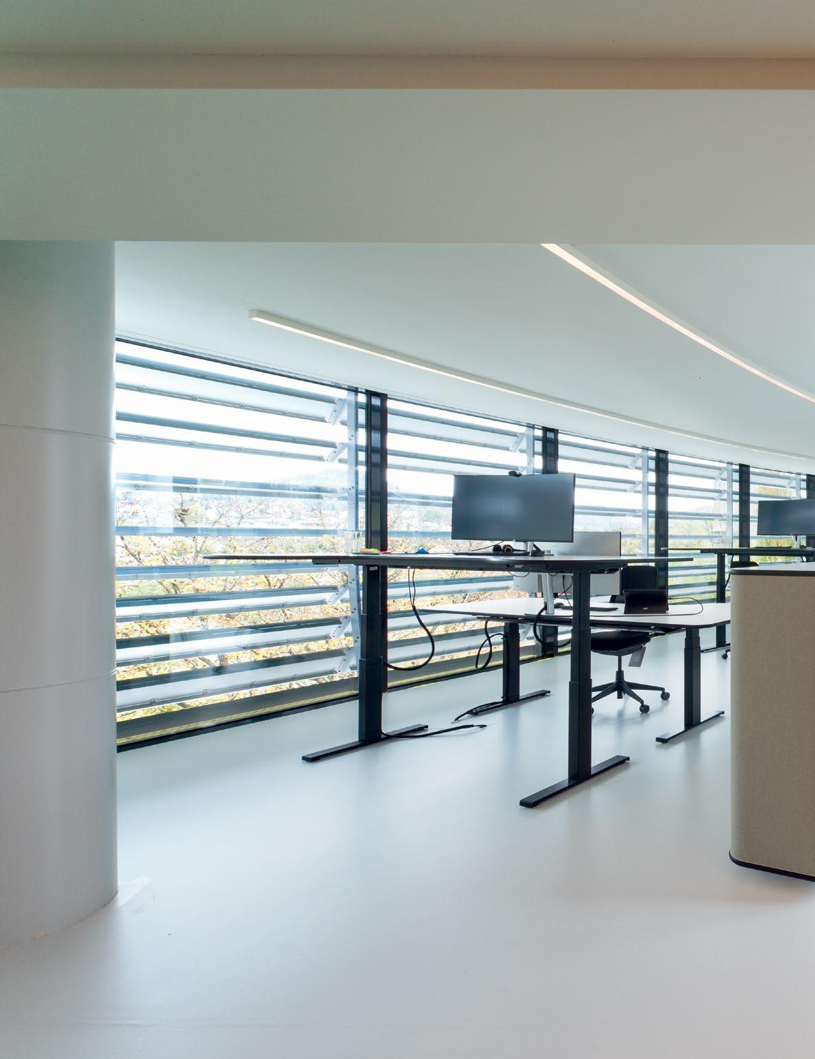 Das Grossraumbüro ist in sechs Team-Bereiche mit jeweils drei bis fünf DoppelArbeitsplätzen aufgeteilt – abgegrenzt sind die Bereiche durch Besprechungsboxen. Jeder Doppel-Arbeitsplatz verfügt über ein Sideboard zur Verstauung der persönlichen Utensilien. Aus gestalterischer Sicht setzen die graugrünen Sideboards mit ihrer abgerundeten Form und textilen Oberfläche einen warmen Kontrapunkt im klinisch-weissen Bürotrakt. Die Tischplatten wurden von Bäumlin + John so designt, dass sich die Nutzenden flexibel ausrichten können. Sie sind aus Holz gefertigt und höhenverstellbar. Über die Glasfassade gelangt viel Tageslicht in die Arbeitsräume. Reicht das Tageslicht nicht aus, wird mit künstlichem Licht ergänzt, exakt auf das erforderliche Niveau. Mittels Bewegungsmelder wird zudem sichergestellt, dass Licht nur dann eingesetzt wird, wenn ein Arbeitsplatz genutzt wird.