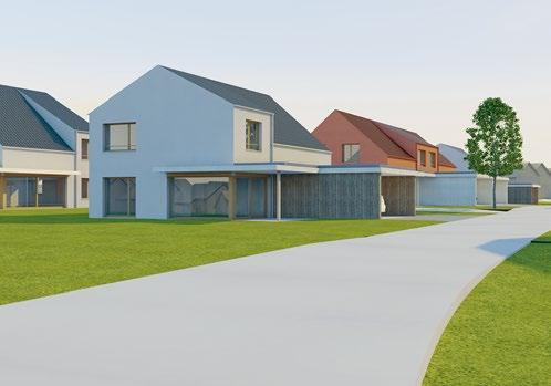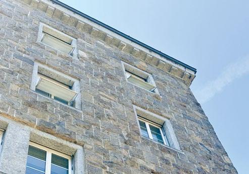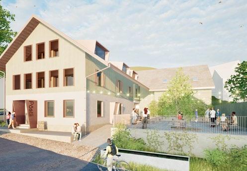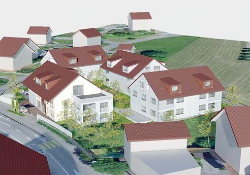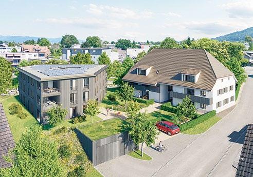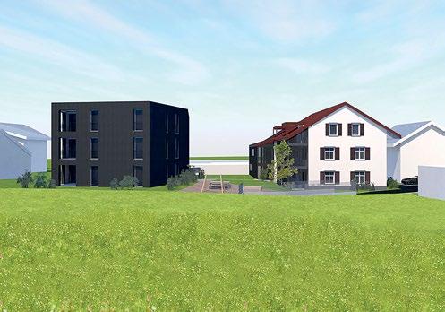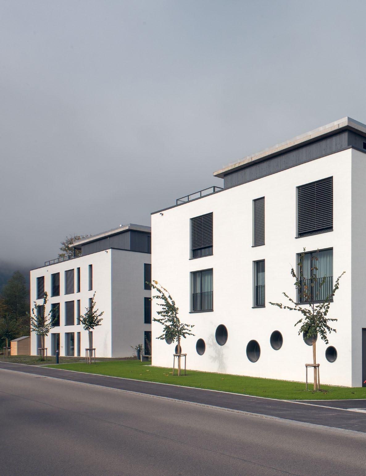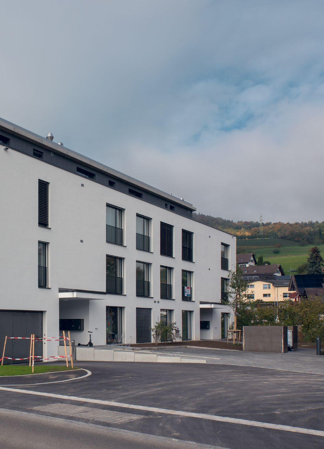 Direkt am Dorfeingang, an sonniger Lage, richten sich die beiden differenziert dimensionierten, viergeschossigen Baukörper mit ihren überdeckten und witterungsgeschützten Loggien nach Südwesten aus. Als stimmiges Ensemble bilden die kompakten Volumen ein optisch ausgewogenes Gesamtbild inmitten eines vielfältigen Naturraums. Mit teils abgeschrägten Kanten lehnen sich die beiden Häuser an den geschwungenen Verlauf des nahen Bachs an. An diesem integriert und definiert der Aussenraum verschiedene Bereiche für Gemeinschaft und Begegnung, Spielplätze für die Kinder, gemütliche Sitzgelegenheiten und Aufenthaltsorte. Ein mit Sträuchern gesäumter Weg führt zwischen den beiden Häusern zum Gemeinschaftsplatz am Bach. Die Wohnungen im Erdgeschoss verfügen zusätzlich über einen eigenen Gartensitzplatz. Das Attikageschoss wiederum umfasst grosszügige Terrassen, die einen herrlichen Ausblick auf die umliegende Landschaft bieten. Die unterirdisch in die Anlage integrierte Autoeinstellhalle mit 29 Auto- sowie Veloabstellplätzen erschliesst jede Wohnung bequem und barrierefrei mit dem Aufzug. Die 2.5- bis 4.5-Zimmer-Wohnungen zeichnen sich durch einfache und gut zu möblierende Grundrisse aus. Dank den raumhohen Verglasungen verfügen sie über sehr helle, lichtdurchflutete Räume, in denen die Natur zu einem Teil des Wohnerlebnisses avanciert; Innen- und Aussenräume (Loggia, Sitzplatz, Umgebung) verschmelzen optisch miteinander; die offene Küche integriert sich harmonisch in den Wohnraum. Der hohe Ausbaustandard, die gut isolierte Gebäudehülle und die systematische Lufterneuerung in allen Räumen mittels individuell steuerbarer Komfortlüftung sorgen für einen hohen Wohn- und Arbeitskomfort. Beheizt wird die Wohnsiedlung mittels einer Grundwasser-Wärmepumpe; die darin integrierte Kühlfunktion (Free Cooling) sorgt im Sommer für angenehme Temperaturen. Beide Häuser sind zudem mit einer PV-Anlage ausgestattet – zusammen erbringen die Anlagen eine jährliche Leistung von 45 000 kw/h.