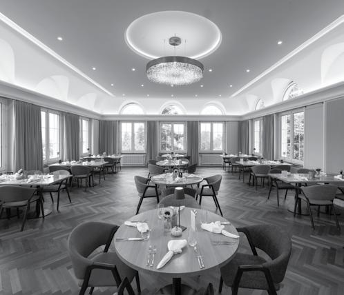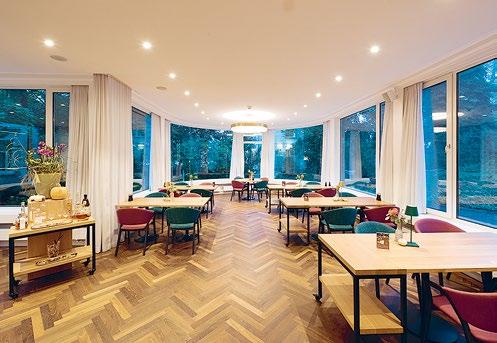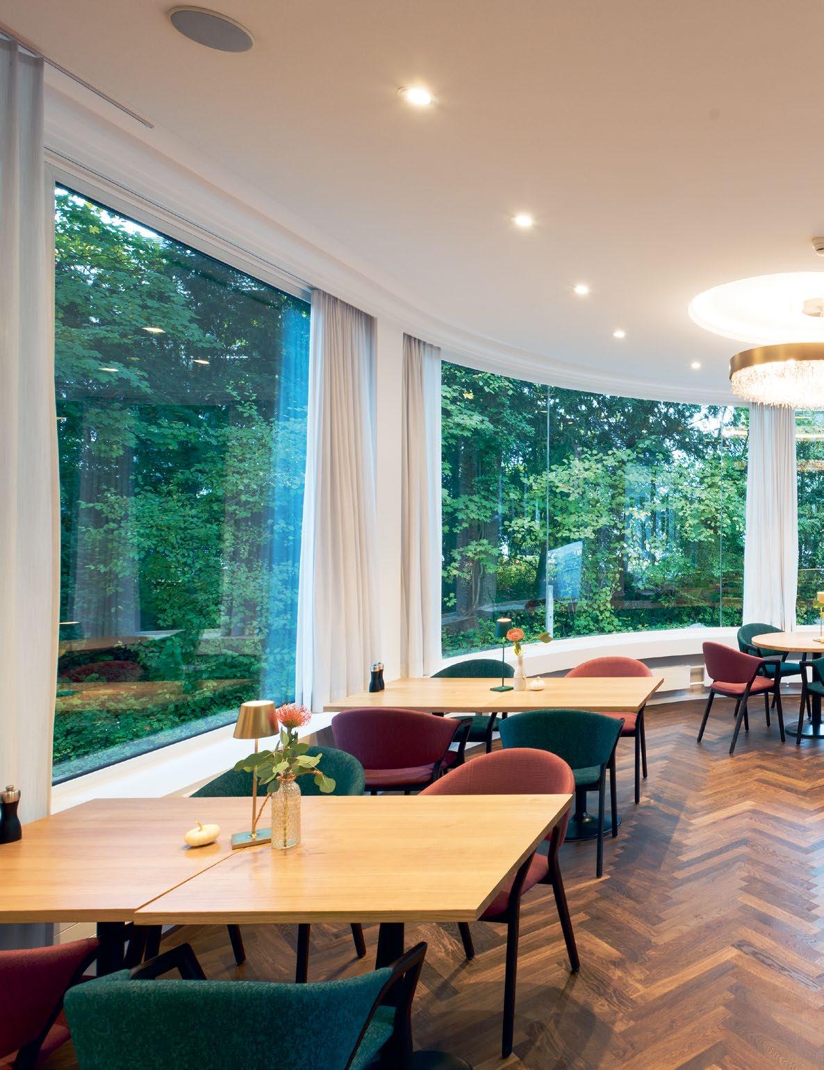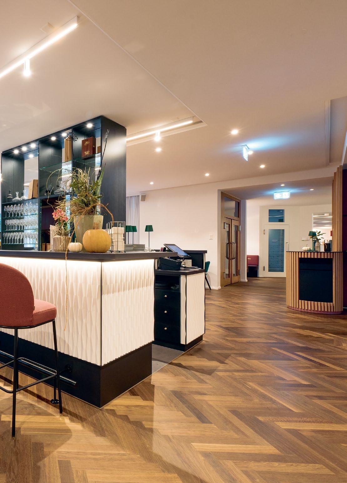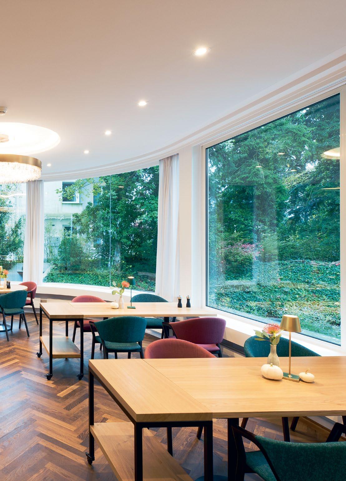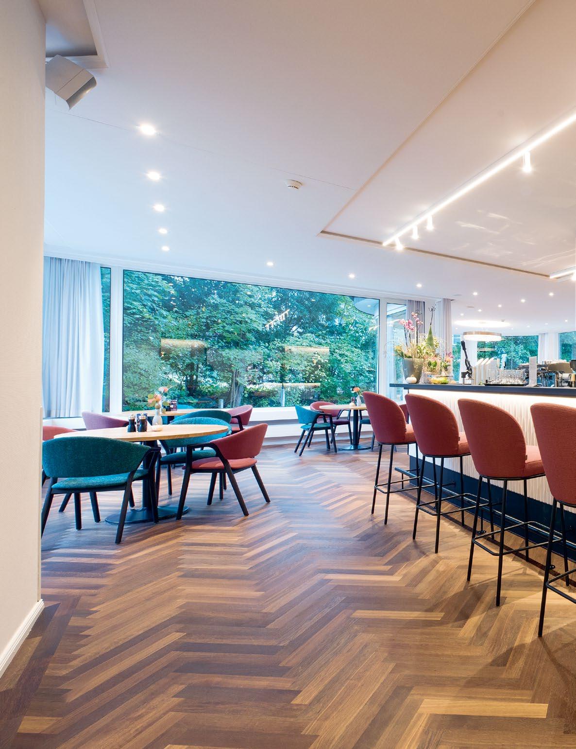 Ein Beispiel für das Zusammenspiel zwischen Natur und Einrichtung ist das neu gestaltete Restaurant mit seinen grünen und roten Stühlen, den gelb changierten Tapeten sowie Tischen aus Holz. Die Möbel und Tapeten nehmen farblich die Natur des Parks auf, der durch die grossen Glasfassaden zu sehen ist. Neu ist auch der abgerundete Tresen aus Holz, der die metallische Rezeption ersetzt. Beim Eintritt ermöglicht ein neues, in den Raum gesetztes Fenster einen Blick zur Rezeption und ins Parterre hinein, Neuankommende können sich nun besser orientieren. Die Zimmer in den Obergeschossen zeichnen sich durch aufgefrischte Oberflächen, modernisierte Bäder und eine neue Möblierung aus. Wo vor kurzem noch Hammerschläge durchs Treppenhaus dröhnten, der Geruch von Farbe über die Korridore waberte und ein Kabel-Wirrwarr von der Decke hing, präsentieren sich nun stimmige Böden und Leuchten. Die unterschiedlichen Unterlagen (u.a. Riemen-Parkett, Teppich, Fischgrätmuster-Parkett aus geräuchterter Eiche) geben den Gästen zu verstehen, in welchem Bereich sie sich befinden. Ein neues Beleuchtungskonzept sorgt für die angemessene Beleuchtung der Räume und für differenzierte Stimmungen. Unter den Leuchten finden sich auch Objekte, die an frühere Zeiten erinnern, mit hunderten daran baumelnden Kristallen. Gleich fünf Elektriker waren an der Montage dieser schweren Leuchtkörper beteiligt.