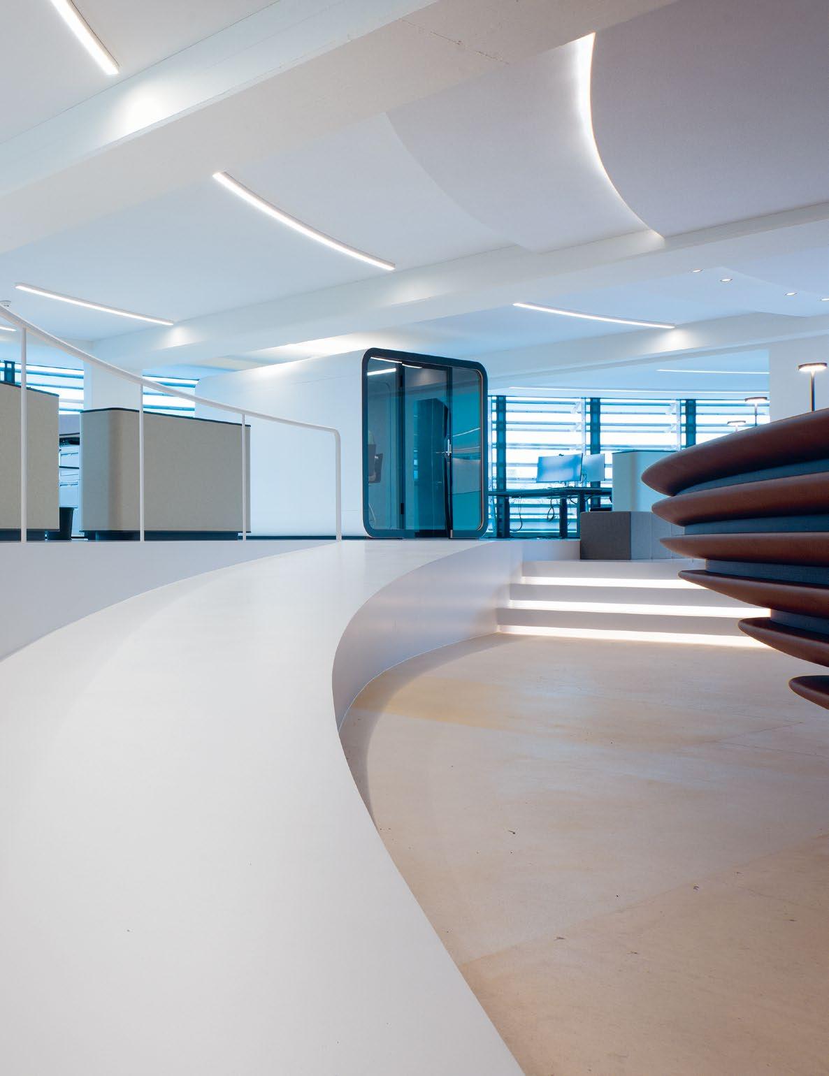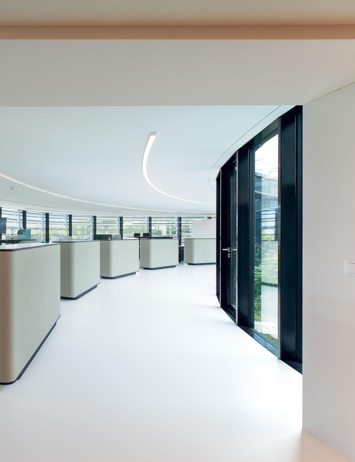 Im Kern des Loops bilden die dunkelbraunen Wandelemente aus Holz einen schönen Kontrast zum harten, beigen Steinholzboden. In die Holzwände sind feine vertikale Strukturen eingefräst. Die dreidimensionalen Wände unterstreichen das wohnliche Ambiente in diesem Bereich und sorgen für eine angenehme Raumakustik. Auch die Decken tragen zur Dämpfung des Schalls bei. Dazu wurden sie mit einem glatten, feinen Akustikputz ausgestattet. Im leicht erhöhten Ringbereich, wo sich die Arbeitsplätze befinden, ist ein homogener weisser «Turnhallenboden» eingebaut. Die im Boden integrierten Rohre der Fussbodenheizung lassen sich im Sommer zur Kühlung nutzen. Statt warmes Wasser fliesst dann kühles Wasser durch die Leitungen.