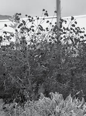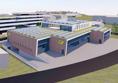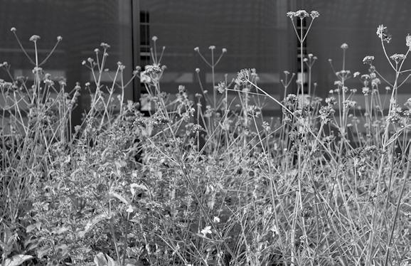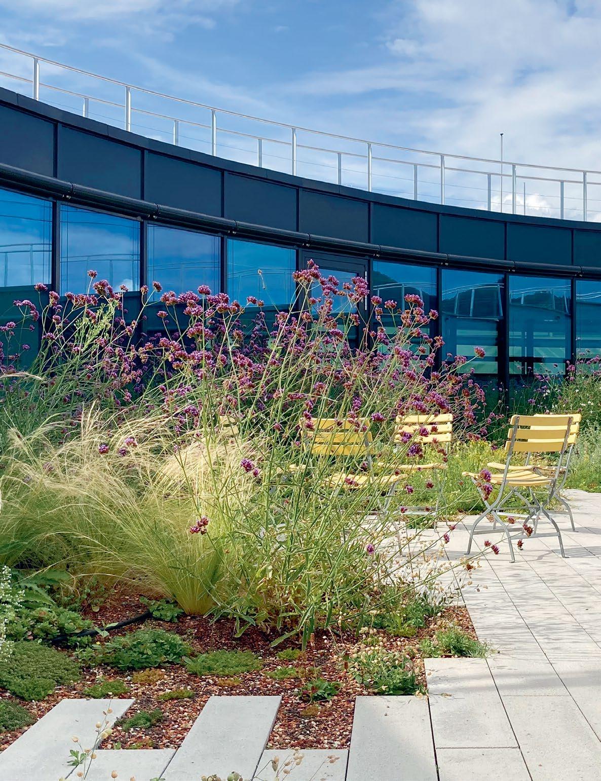 Der Innenhof des «Loops» wird von den im Gebäude ansässigen Firmen gemeinschaftlich genutzt. Der Hauptzugang zum Dachgarten erfolgt über das Treppenhaus. Auf relativ kleiner Fläche eröffnet sich hier eine erstaunlich vielfältige und attraktive Gartenlandschaft – mit blühenden Beeten, «wilden Nischen» und bestuhlten Plätzen. Ein Ort zum Kopf-Auslüften, der auch der regionalen Biodiversität zugute kommt. Die spezielle Anordnung der langgezogenen Steinplatten lässt das Grün förmlich in die Wege und Plätze hineinfliessen. Unterschiedliche Substrathöhen schaffen ein dreidimensionales, dynamisches Gartenbild. Vom Innenhof führt eine Metalltreppe auf das Dach des Ringtrakts, wo ein durchgehender, abgesicherter Rundlauf spektakuläre Aussichten bietet. Auf diesem Dach wird eine Photovoltaikanlage eingerichtet, welche das Gebäude mit Strom versorgt.