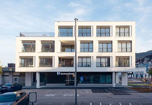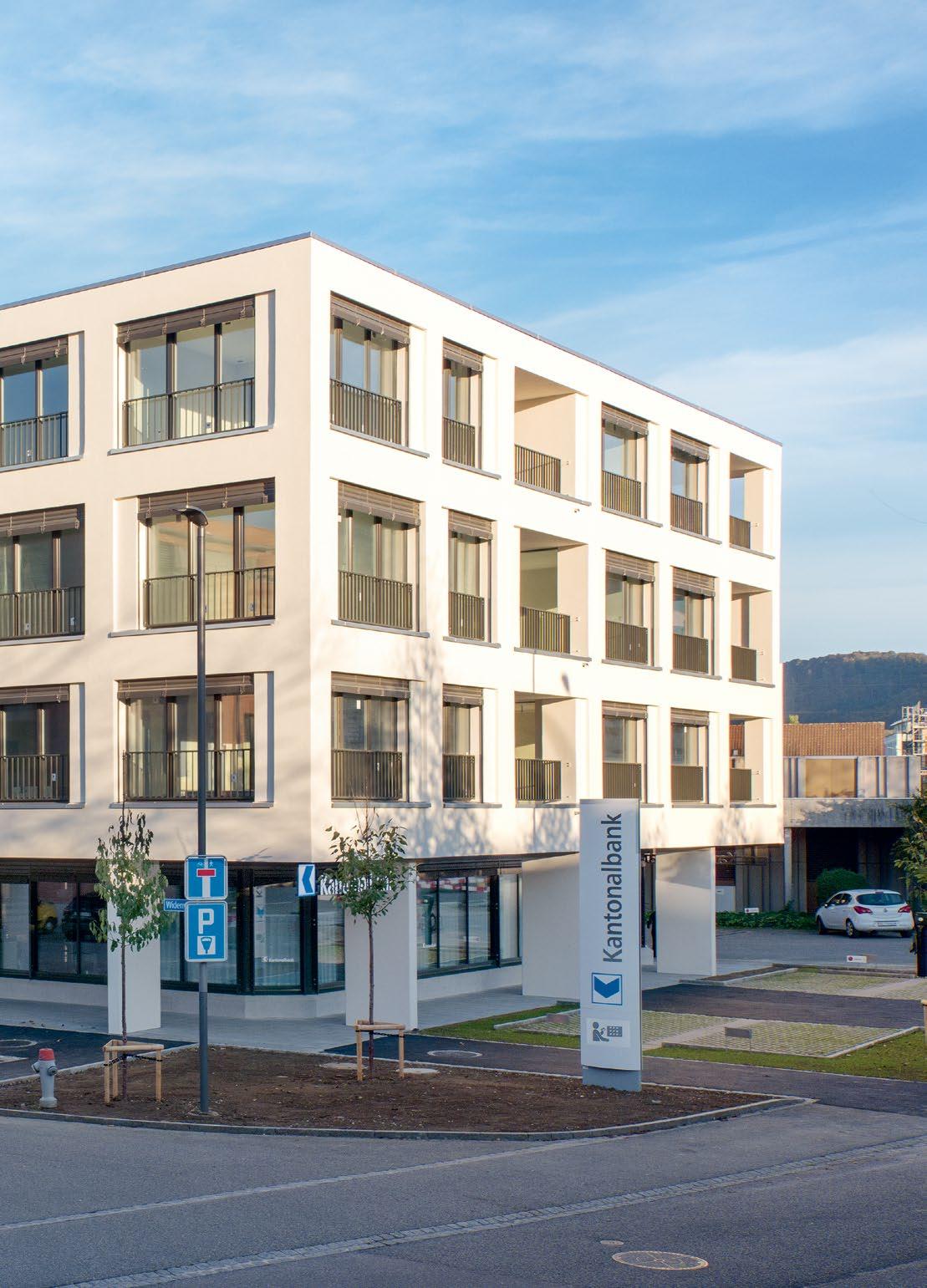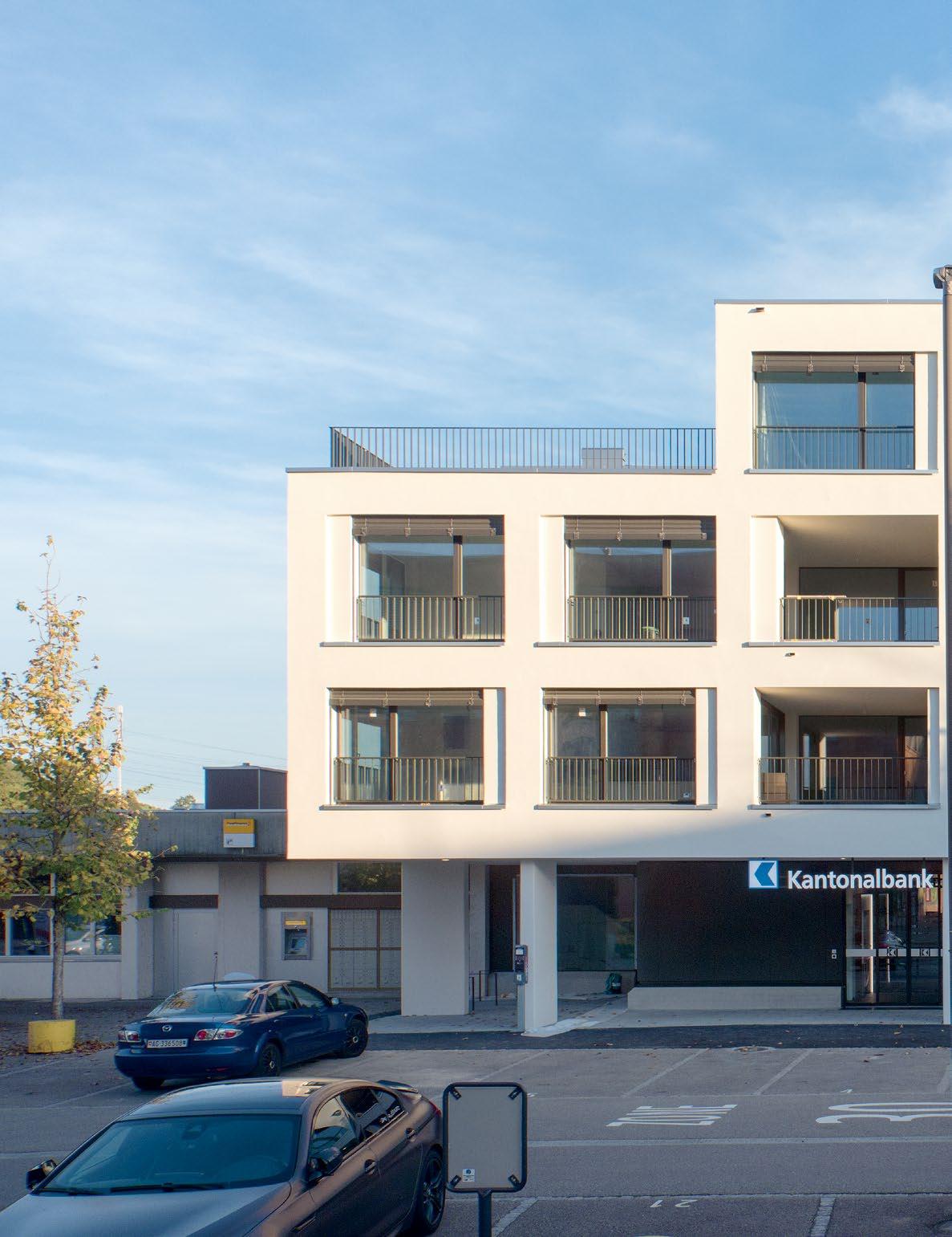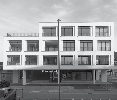 Unten Bank, oben Wohnen. Um zwei Stockwerke erhöht, präsentiert sich das Gebäude der Aargauischen Kantonalbank (AKB) am Widenplatz, im Zentrum von Frick, neu mit fünf Geschossen. Das veränderte Gefüge macht die zweigeteilte Nutzung – mit dunklem Banksockel und hellverputztem Wohnungsteil – in der äusseren Gesamterscheinung ablesbar und bildet ein hochwertiges Gebäude, das sich als städtischer Baustein in seiner Präsenz angemessen behauptet. Das 1977 errichtete, an die Post angebaute Gebäude blieb insgesamt erhalten und in seiner Grundfläche weitgehend bestehen. Die Aufstockung um ein zweites Ober- und ein Attikageschoss schont das Bauland und verdichtet zugleich in der Kernzone. Die Standortoptimierung bedingte eine präzise Auslotung der Eingriffstiefe und ist ein Mix aus erhaltenen und neuen Bauteilen. Das bestehende Flachdach musste abgerissen werden, ebenso nichttragende Stützen für die Erneuerung der Fassade respektive für eine nach aussen verlegte Fassadenfläche. Geblieben sind die Stützen im Aussenbereich des Erdgeschosses und die vorhandene Bausubstanz bis und mit Decke im ersten Obergeschoss. Die in die gegebene Grundfläche zu integrierenden acht Mietwohnungen (3.5- und 4.5-Zimmer) waren eine Herausforderung. Der von der Bank losgelöste Erschliessungskern mit Treppe und Lift, der als Puffer zum bestehenden Postgebäude funktioniert, schafft dabei zweierlei: Er erschliesst auf möglichst kurzem Weg jeweils die drei Wohnungen der beiden Obergeschosse und ermöglicht den nötigen Freiraum für die Attikawohnungen, deren Zugänge im Freien über gedeckte Terrassen erfolgen. In sämtlichen Wohnungen sorgen raumhohe Fenster für lichtdurchflutete Wohnräume. Die Grundrisse zeichnen sich durch eine klare Aufteilung in Nacht- und offen gestaltete Tagesbereiche sowie subtil eingebaute Loggien aus. Im Erdgeschoss entfalten sich die vollständig neu angeordneten Räumlichkeiten der aufgefrischten und modernisierten Niederlassung der AKB. Die Niederlassung Frick wurde nach dem 2-ZonenKonzept der AKB (mit Kunden- und Beratungszone) umgebaut. Die Bank-Räumlichkeiten präsentieren sich in einem frischen, modernen und digitalen Gewand. Mit der adäquaten Gestaltung und Ausstattung der Kundenzone und der Beratungszone gelingt gemäss AKB «die Verschmelzung der physischen mit der digitalen Welt».