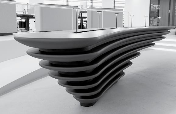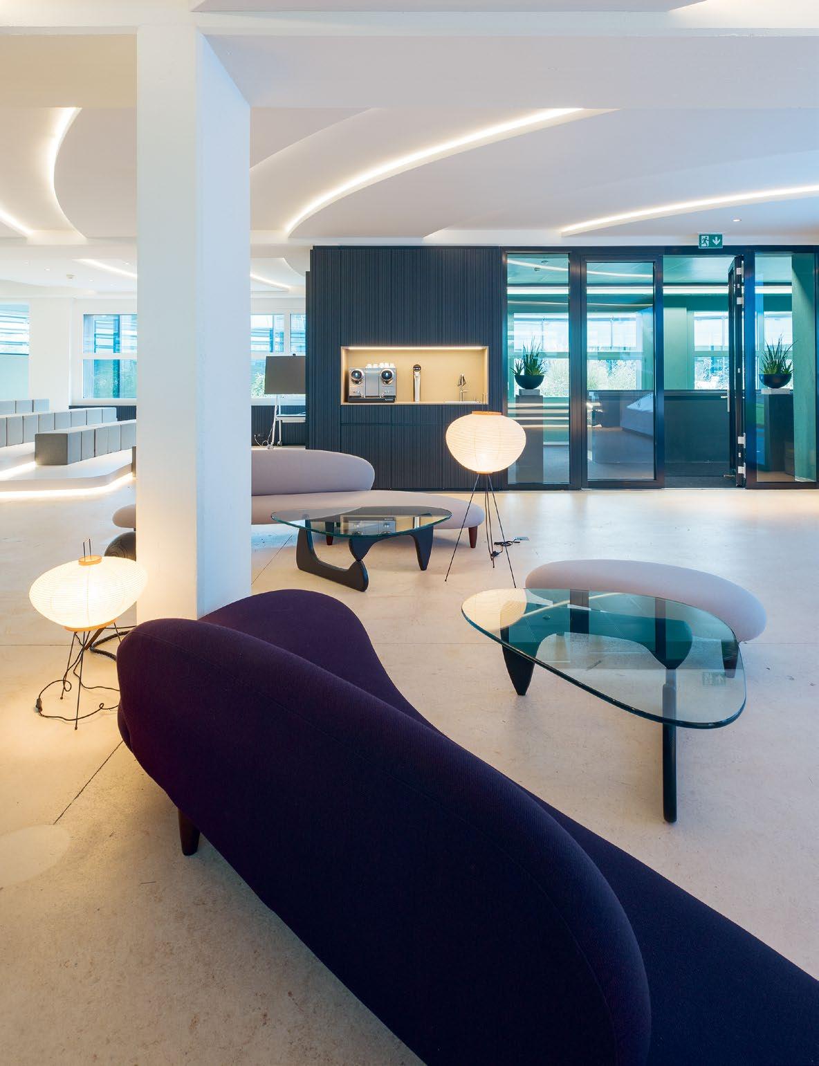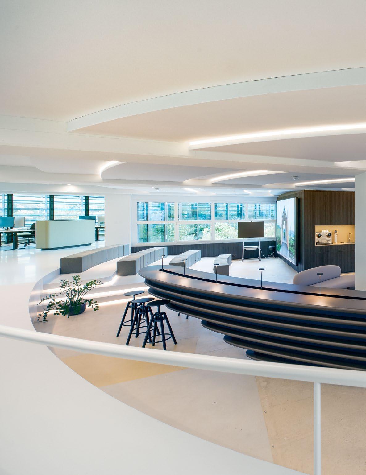 In beiden Bereichen finden sich ausschliesslich ab gerundete Möbel. Eine Referenz an die «Loop»-Form? Ja, wir wollten die Rundungen auch im Innern aufnehmen. Und gerade im «coolen» Bürotrakt schaffen sie einen spannenden Kontrast und sorgen zusammen mit den warmen textilen Oberflächen der Sideboards für Behaglichkeit. Und noch ein weiterer Grund spricht für das Runde: An einem grossen, abgerundeten Tisch sind die Konferenzteilnehmenden besser eingebunden als an einem eckigen Tisch.