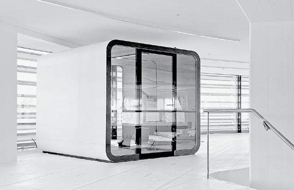 Den Mitarbeitenden von Bäumlin + John stehen insgesamt sechs Besprechungsboxen zur Verfügung. In den schallgedämpften Boxen finden bis zu vier Personen Platz, um an Videokonferenzen teilzunehmen. Man kann dort auch in Ruhe ein Telefongespräch führen oder mit dem Tablet arbeiten. Die Boxen dienen zugleich als attraktive Raumteiler. In derselben geschwungenen Form und ebenfalls in weiss mit schwarzem Rahmen präsentiert sich die Musterbox. Darin sind – als haptische Elemente in einem volldigitalisierten Büro – Muster von Bodenbelägen, Wandputzen, Fassaden etc. enthalten. Die in der Box integrierten Schubladen lassen sich ganz einfach herausnehmen, mit projektspezifischen Mustern bestücken und an eine Präsentation mitnehmen. Das vielleicht auffälligste Möbel im «Loop» ist die grosse geschwungene Kaffeebar mit den filigranen kleinen Leuchten. Sie lädt zum Austausch vor Ort ein.