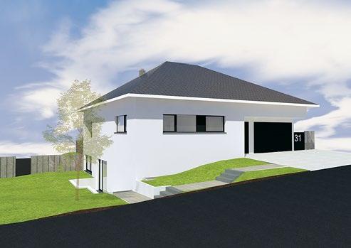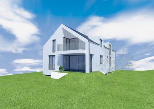 Der Zugang zum dreigeschossigen Haus erfolgt über die Quartierstrasse. Im EG ist rechtsseitig eine Doppelgarage untergebracht, der Hauseingang befindet sich in der Mitte des EG. Er führt in einen grosszügigen Koch-/Essbereich. Rechts davon und leicht nach vorne versetzt ist das Wohnzimmer platziert. Diese windrädchenartige Anordnung hat einen verblüffenden Effekt: Obschon die Räume offen sind, wirken sie wie in sich geschlossen und bieten Halt. Über eine zentrale Treppe gelangt man ins Attika, wo sich der Elternbereich befindet. Im Sockelgeschoss sind weitere Zimmer für die Kinder, ein Bad und ein zentraler Multiraum untergebracht – mit Zugang zu einem gedeckten Sitzplatz.