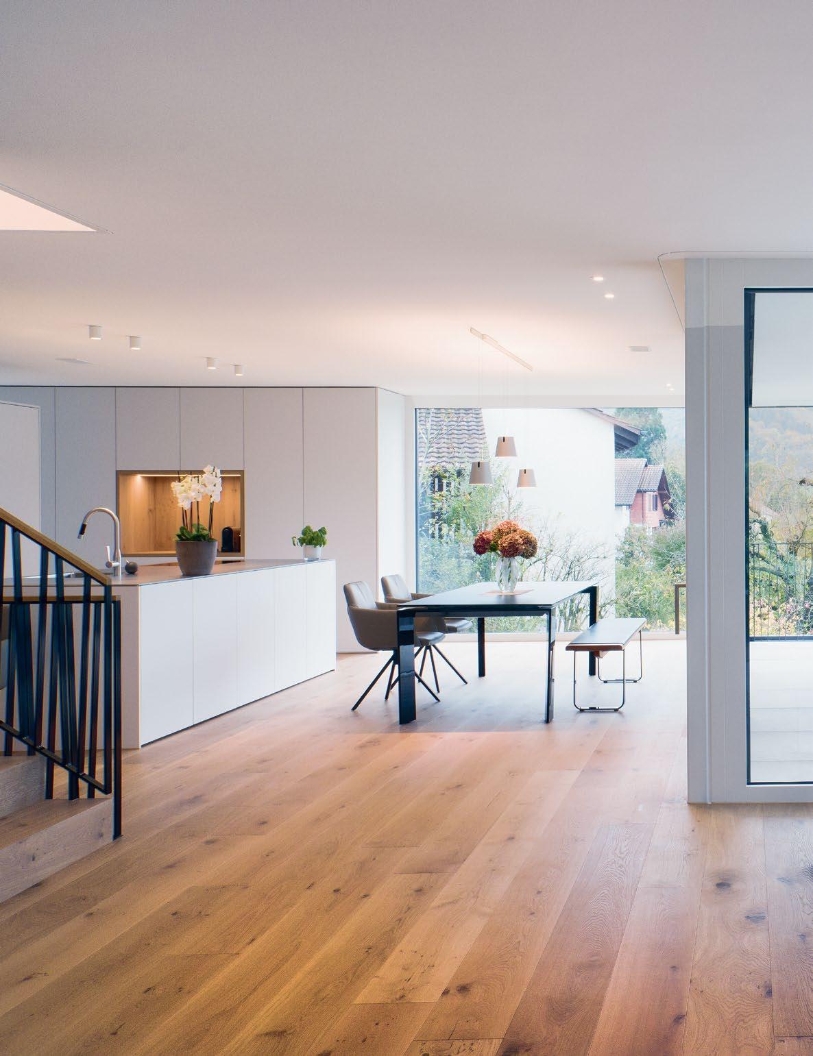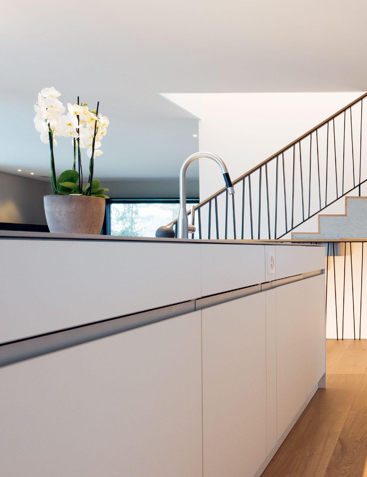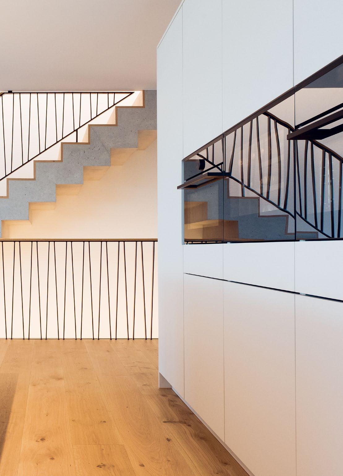 Auffällig ist der hochwertige Innenausbau. Die zentrale Treppe aus Sichtbeton etwa besticht mit ihren scharfen Kanten, einem präzise eingebauten Metallgeländer aus abgeknickten Staketen und perfekt eingefassten Lichtbändern. Präzise verarbeitet sind auch die drei unterschiedlich hohen, weissen Möbelblöcke, die den Koch-/Essbereich prägen. In einem der Möbel ist eine Holznische eingelassen, die das Eichenholzparkett des Bodens aufnimmt. Die Reduktion auf wenige Materialien und Farben – hauptsächlich schwarz und weiss – zieht sich durch das ganze Haus und schafft eine zeitlose Eleganz.
