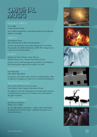 ORIGINAL MUSIC ASSASSIN'S CREED III Lorne Balfe Ubisoft Montreal/Ubisoft An excellent orchestration, with great melodies; the production quality is very high. DIABLO III Development Team Blizzard Entertainment/Blizzard Entertainment A new score that reuses some classic themes to fit well within the gameplay. A polished production, Diablo III ’s arrangement is a great mix and well presented. JOURNEY Keith Leary, Monty Mudd, Austin Wintory thatgamecompany/Sony Computer Entertainment Europe Journey’s score is both haunting and memorable: its atmospheric, fresh sound palette supports the storyline very well. THOM AS WAS ALONE David Housden Mike Bithell/Mike Bithell Its inventive and creative music raises the overall gameplay, while its distinctive arrangement evokes clever emotional development. THE UNFINISHED SWAN Joel Corelitz, Keith Leary, Peter Scaturro Giant Sparrow/Sony Computer Entertainment Europe An impressive selection of instruments and impeccable attention to detail portrays a great sense of wonder and is well-suited to the game’s narrative. THE WALKING DEAD Jared Emerson-Johnson Telltale Games/Telltale Its very high quality composition – using a wide sound palette of traditional and ‘found’ sounds – helps take the player on an emotional journey.