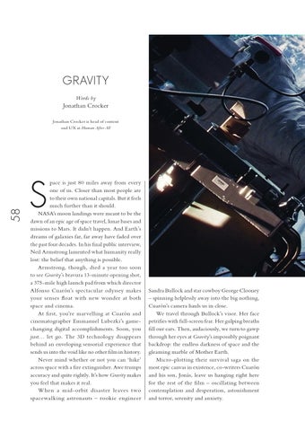pace is just 80 miles away from every one of us. Closer than most people are to their own national capitals. But it feels much further than it should. NASA’s moon landings were meant to be the dawn of an epic age of space travel, lunar bases and missions to Mars. It didn’t happen. And Earth’s dreams of galaxies far, far away have faded over the past four decades. In his final public interview, Neil Armstrong lamented what humanity really lost: the belief that anything is possible. Armstrong, though, died a year too soon to see Gravity’s bravura 13-minute opening shot, a 375-mile high launch pad from which director Alfonso Cuarón’s spectacular odyssey makes your senses fl oat with new wonder at both space and cinema. At fi rst, you’re marvelling at Cuarón and cinematographer Emmanuel Lubezki’s gamechanging digital accomplishments. Soon, you just… let go. The 3D technology disappears behind an enveloping sensorial experience that sends us into the void like no other fi lm in history. Never mind whether or not you can ‘hike’ across space with a fi re extinguisher. Awe trumps accuracy and quite rightly. It’s how Gravity makes you feel that makes it real. When a mid-orbit disaster leaves two spacewalking astronauts – rookie engineer