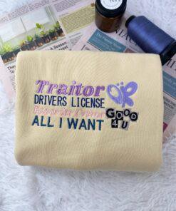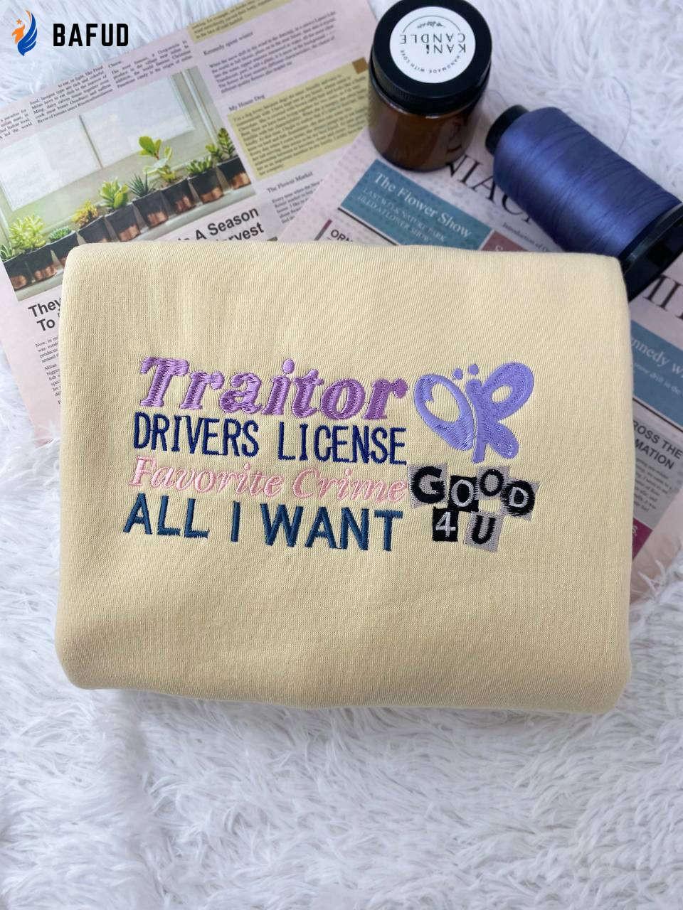 Introducing the Olivia Rodrigo Songs Embroidered Crewneck TShirt/Sweatshirt, the perfect gift for men and women. Made with premium quality materials, this shirt is designed to provide ultimate comfort and style. Featuring the iconic Olivia Rodrigo song titles embroidered on the front, it adds a trendy and fashionable touch to any outfit. Whether you're a fan of "drivers license" or "good 4 u," this shirt allows you to proudly showcase your love for Olivia Rodrigo's music. With its versatile design, it can be worn casually or dressed up for any occasion. The highquality construction ensures durability, making it a long-lasting addition to your wardrobe. Available in a range of sizes, this shirt is suitable for both men and women. Surprise your loved ones with this unique and thoughtful gift that celebrates their favorite artist. Order now and experience the joy of wearing this exclusive Olivia Rodrigo Songs Embroidered Crewneck T-Shirt/Sweatshirt!