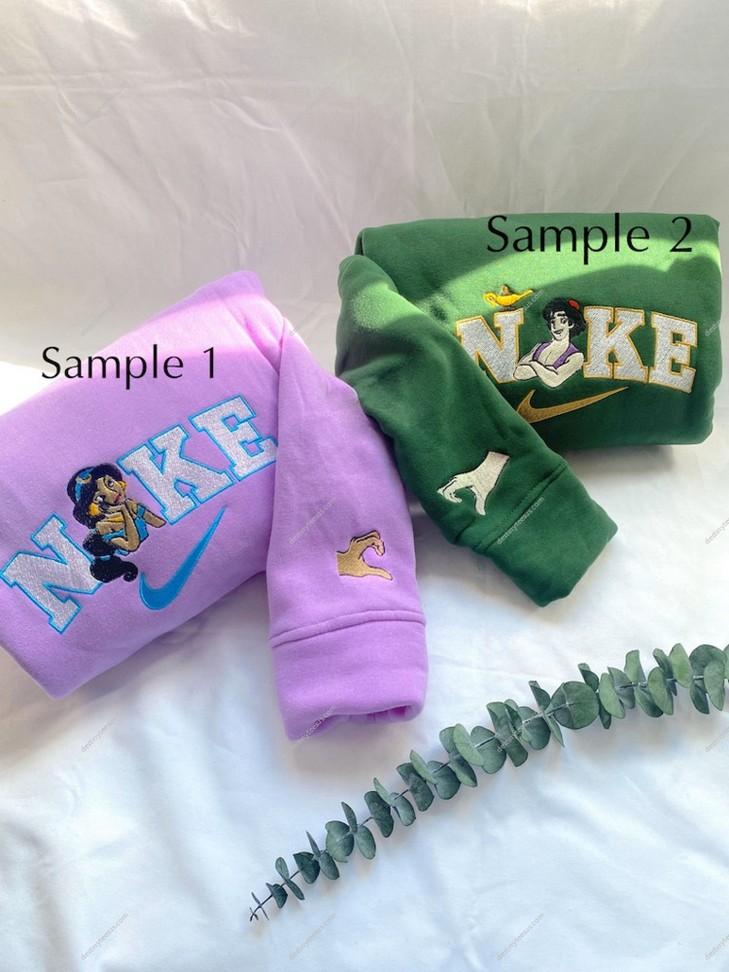 Embroidered Crewneck T-Shirt! This sweatshirt for men and women is adorned with exquisite embroidery, capturing the enchanting love story between Aladdin and Jasmine. Made from premium quality fabric, it offers a comfortable and cozy fit, perfect for any occasion. The crewneck design adds a touch of elegance, while the vibrant colors bring the characters to life. Whether you're a fan of Disney or simply appreciate the beauty of this iconic couple, this shirt is a must-have addition to your wardrobe. Embrace the wonder and nostalgia of Aladdin and Jasmine's tale, and let your outfit tell a captivating story. Experience the magic today!
