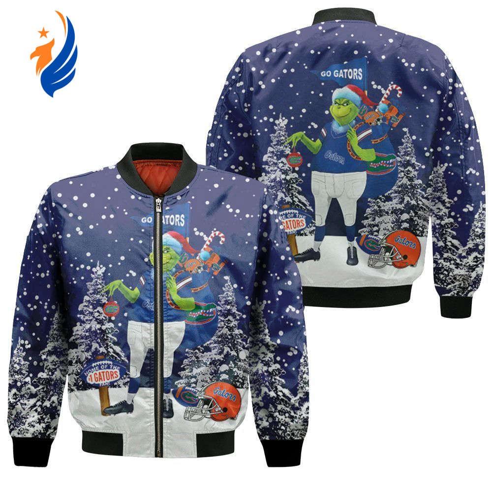 The Grinch Florida Gators Christmas Bomber Jacket is the ultimate holiday gift for men and women who love sports and festive style. Made with premium materials, this jacket features the iconic Grinch and Florida Gators logos, creating a unique and eye-catching design. The jacket is not only fashionable but also functional, with its durable construction and comfortable fit. Whether you're cheering on your favorite team or spreading holiday cheer, this jacket is sure to make a statement. The value it offers to the customer is unmatched, as it combines two beloved themes into one amazing piece of clothing. Get ready to turn heads and show off your team spirit this Christmas with the Grinch Florida Gators Christmas Bomber Jacket!
