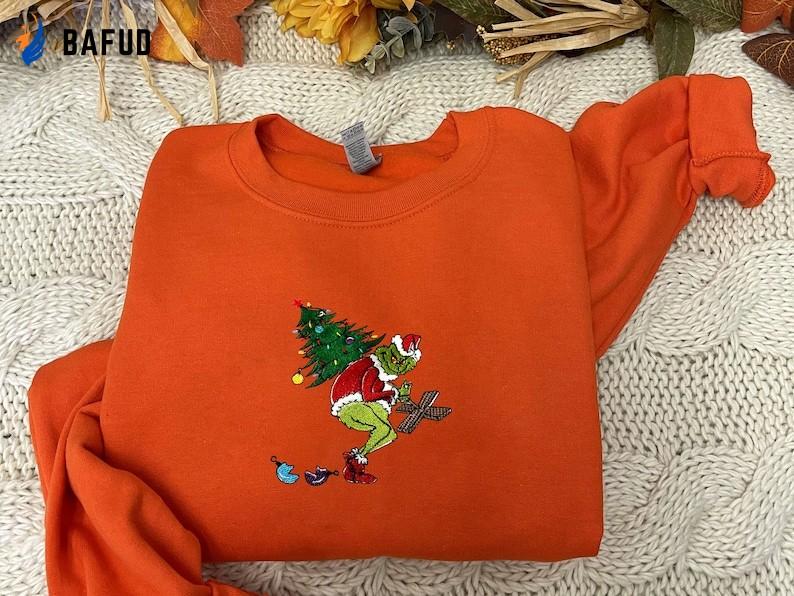 The Grinch Christmas Tree Embroidered Crewneck T-Shirt is the perfect holiday attire for men and women. This cozy sweatshirt boasts an intricate embroidery of the iconic Grinch with a Christmas tree, adding a touch of festive cheer to your wardrobe. Made with premium quality materials, it guarantees exceptional comfort and durability. Whether you're attending a holiday party or lounging at home, this shirt will keep you stylish and snug. Embrace the spirit of the season and spread joy with this Grinch-inspired sweatshirt. Get yours now and celebrate Christmas in style!