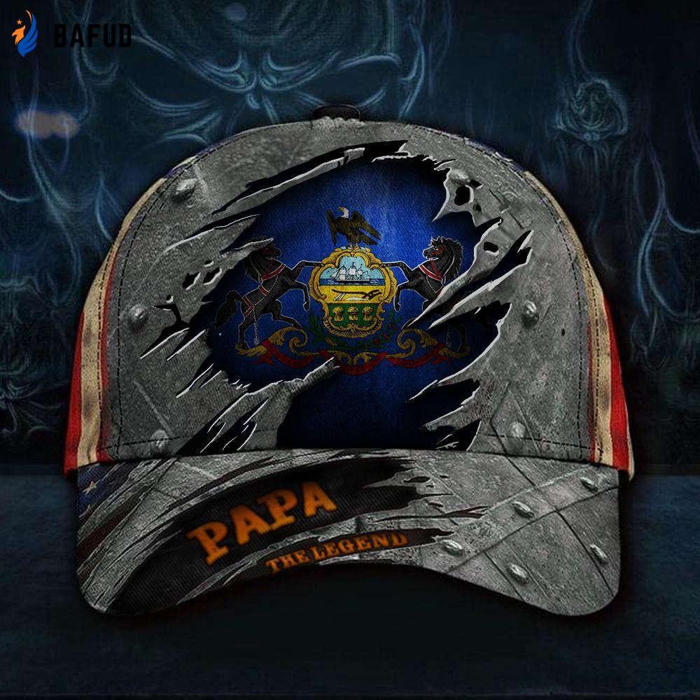 Designed with exceptional craftsmanship, this cap features a 3D embroidered "Papa The Legend" logo on the front, adding a stylish touch to any outfit. The vintage distressed look gives it a timeless appeal, making it a wardrobe staple for any proud Pennsylvanian.