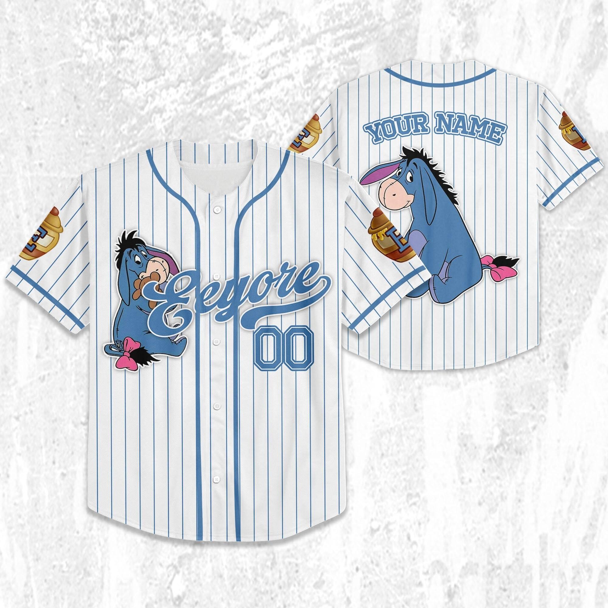 Introducing our Custom Disney Winnie the Pooh Eeyore Baseball Jersey, a must-have for every Disney fan! Made with premium materials, this jersey showcases Eeyore's adorable character, bringing your favorite childhood memories to life. Its vibrant colors and detailed stitching create an eye-catching design that stands out from the crowd. With its comfortable fit and breathable fabric, you can wear this jersey all day long, whether you're cheering on your favorite team or exploring the Disney parks. The value it offers is unmatched, as it allows you to showcase your love for Disney and Eeyore in a unique and personalized way. Get ready to make a statement with our Custom Disney Winnie the Pooh Eeyore Baseball Jersey!