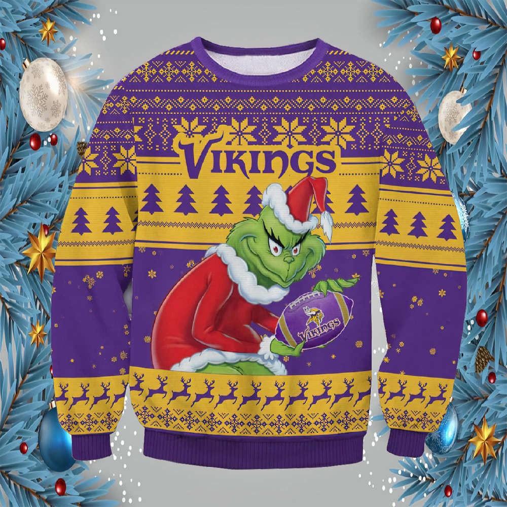 The Grinch Vikings Christmas Sweater is the perfect blend of holiday cheer and team spirit! Featuring a festive design with the iconic Grinch and the Vikings logo, this sweater is a musthave for any fan. Made from high-quality materials, it offers warmth and comfort during the chilly winter months. With its vibrant colors and intricate detailing, it is sure to make you stand out at any holiday event. Whether you're attending a Christmas party or cheering on your team, this sweater is a great way to show off your holiday spirit and support for the Vikings. Don't miss out on this unique and stylish sweater that combines two beloved themes into one incredible garment. Get yours today and spread joy and laughter this holiday season!