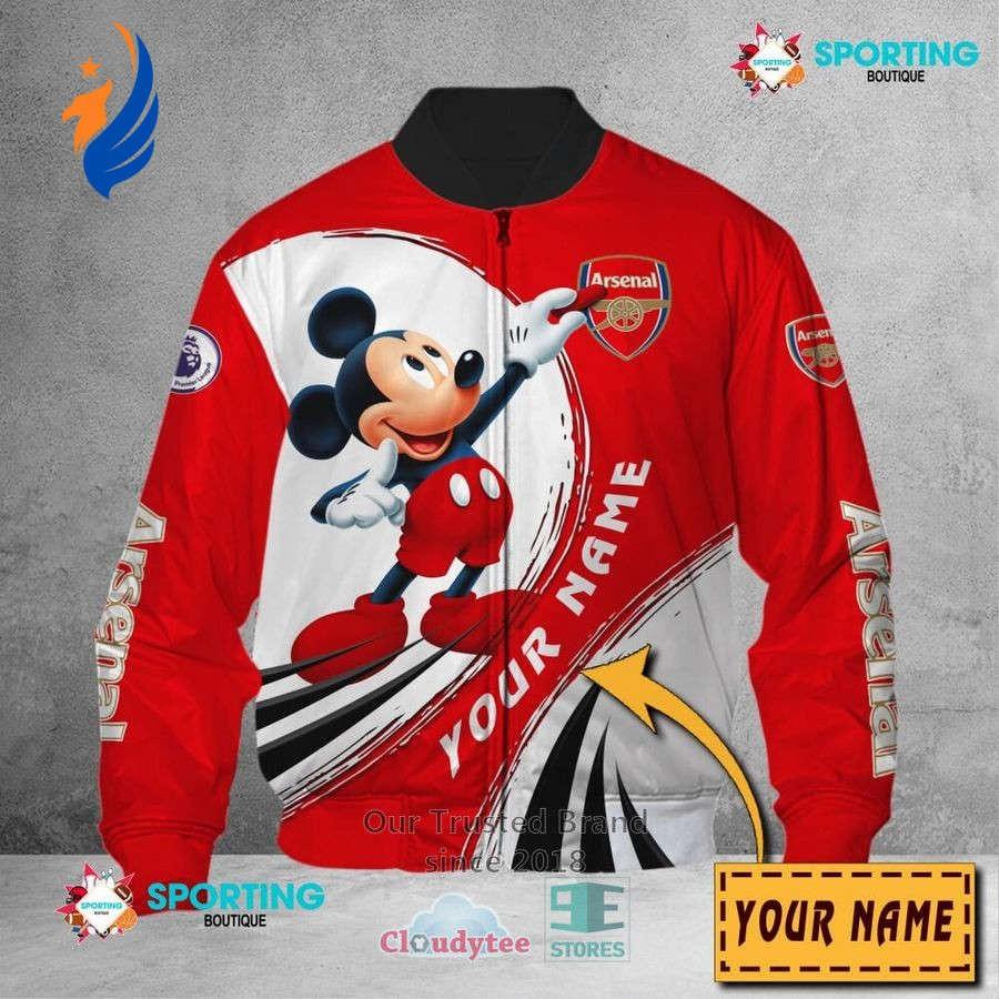 Introducing the Arsenal FC Custom Name Mickey Mouse Bomber Jacket - the perfect blend of style and fandom! Made from highquality materials, this jacket features the iconic Mickey Mouse design with personalized Arsenal FC name embroidery. The jacket is not only a fashion statement but also offers incredible comfort and durability. With its ribbed cuffs and hem, it provides a perfect fit and keeps you warm during chilly game nights. Show off your love for Arsenal FC and Mickey Mouse while staying cozy and trendy. This jacket is a must-have for any true fan. Get yours today and be the envy of all Arsenal supporters!