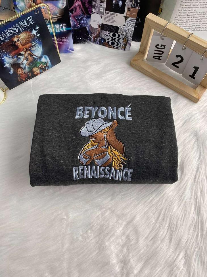 The Beyoncé Renaissance Embroidered Crewneck T-Shirt/Sweatshirt is a must-have for fashion enthusiasts. Made with premium quality materials, this shirt showcases an intricate embroidery of Beyoncé's iconic image, capturing her timeless beauty and influence. With its comfortable fit and stylish design, it is suitable for both men and women, making it a versatile addition to any wardrobe. The shirt not only pays homage to an iconic artist but also allows you to express your admiration for her artistry. Get ready to turn heads and make a bold statement with this unique and fashionable piece. Elevate your style and show your love for Beyoncé with this one-of-a-kind shirt.