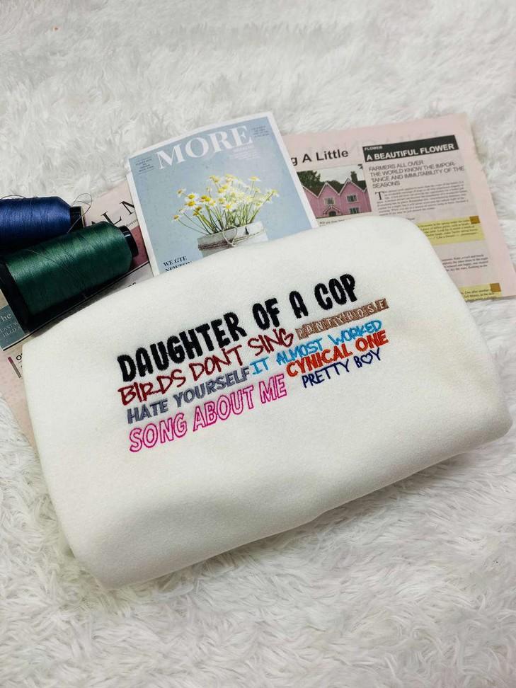 Introducing the TV Girl Songs Daughter Of A Cop Embroidered Crewneck T-Shirt, Sweatshirt for Men Women Shirt. This trendy and comfortable apparel is designed for music lovers and those proud to support law enforcement. Made with high-quality materials, it offers a perfect fit and durability for everyday wear. The eye-catching embroidered design showcases your unique style and passion. Whether you're attending a concert or simply relaxing at home, this shirt is a must-have addition to your wardrobe. With its versatile design, it can be effortlessly paired with jeans, shorts, or leggings, allowing you to create various stylish outfits. Express your love for both music and law enforcement with this one-of-a-kind shirt. Grab yours now and let your fashion sense shine!