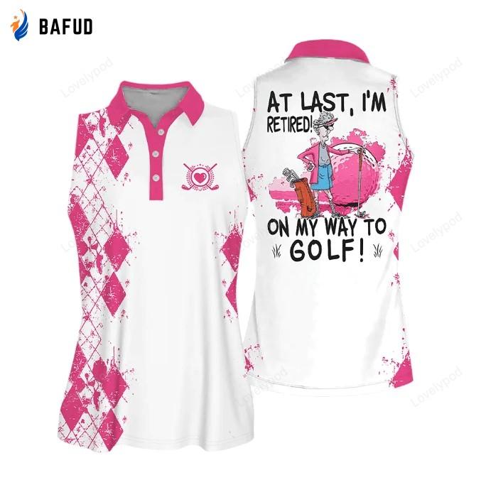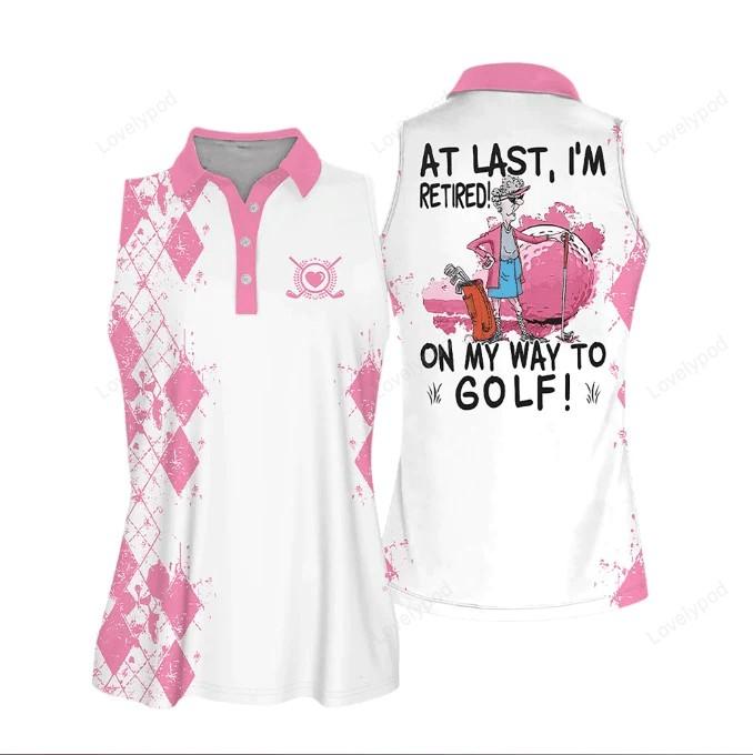 Sleeveless Women Polo Shirt For Ladies, At Last I'm Retired. On My Way To Golf Shirt, Golf Lover Shirt, Retiree Gift