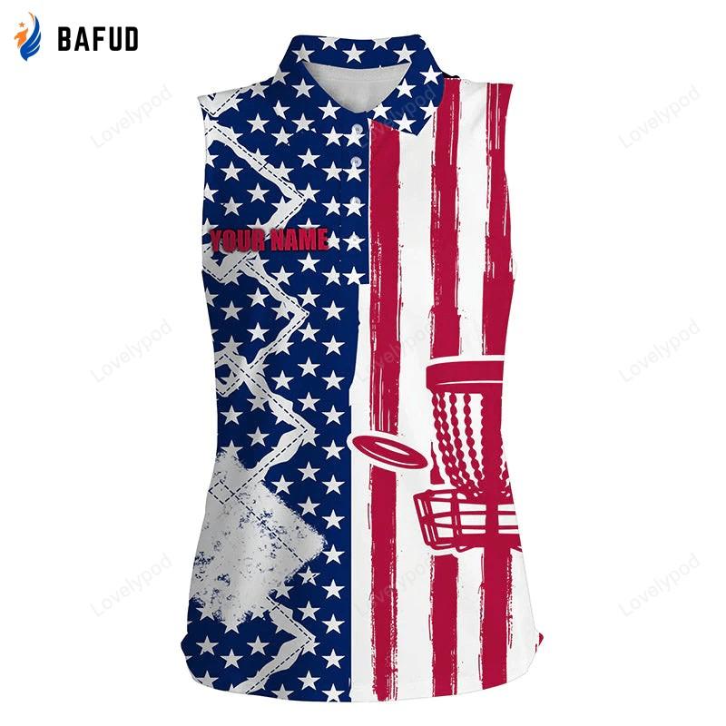 Introducing our Women's Disc Golf Sleeveless Polo Shirt, a perfect blend of style and patriotism! This custom name American flag design makes it an ideal personalized disc golf gift for the passionate players out there.