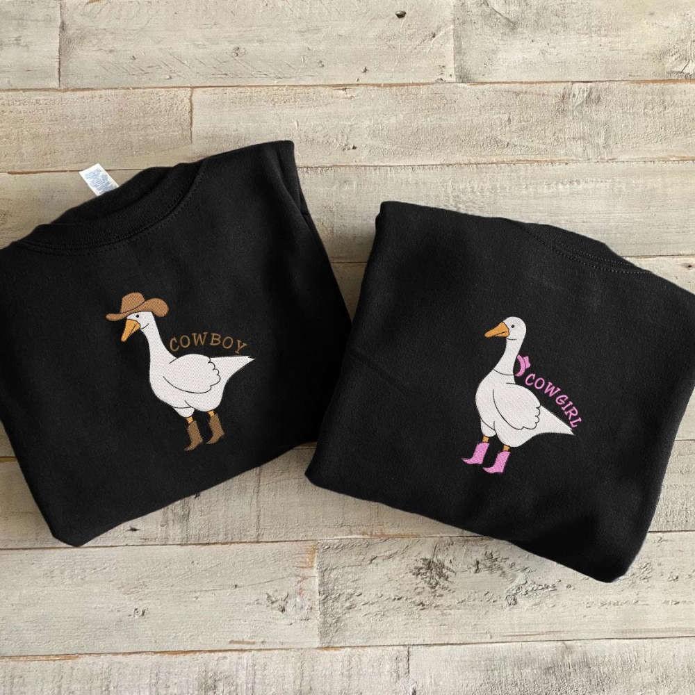 With their vibrant colors and attention to detail, these sweatshirts and shirts are bound to turn heads wherever you go. Whether you're strolling around town, attending a westernthemed party, or simply want to express your love for all things western, our Cowgirl Silly Goose Embroidered Sweatshirts, Retro Silly Cowboy Shirt, Cowgirl Silly Goose Shirt, Duck Shirt, and Western Duck Shirt are the perfect choice.