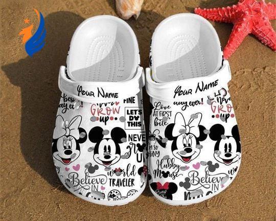 Don't miss the opportunity to add a touch of magic to your footwear collection. Get your personalized Mickey and Minnie Cute Custom Name Crocs-Slippers Classic Clogs Shoes in White today!