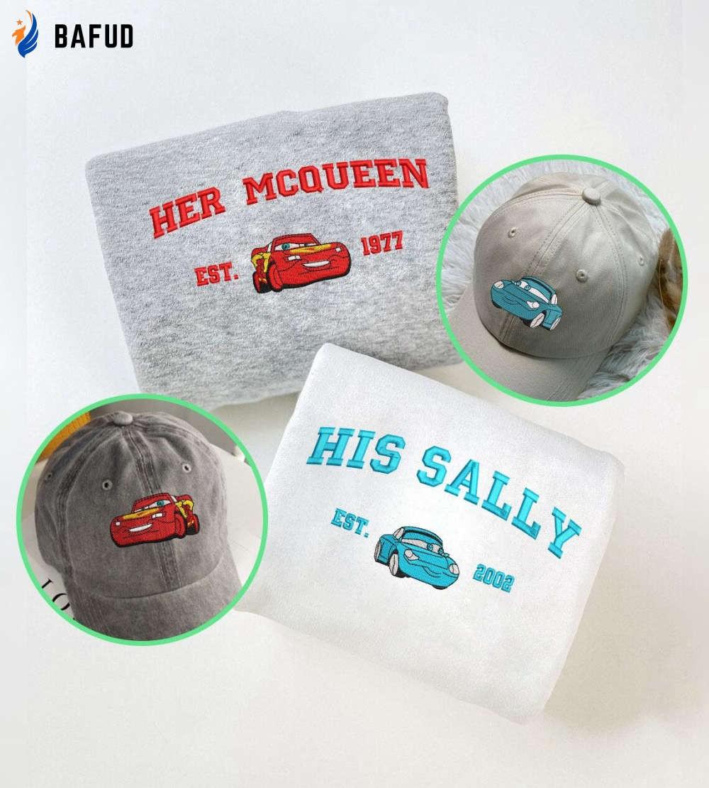 Her Mcqueen & His Sally Combo Embroidered Shirt and Hat - Perfect Cars Movie Couple Gift for Dad and Mom! ESHH005-006