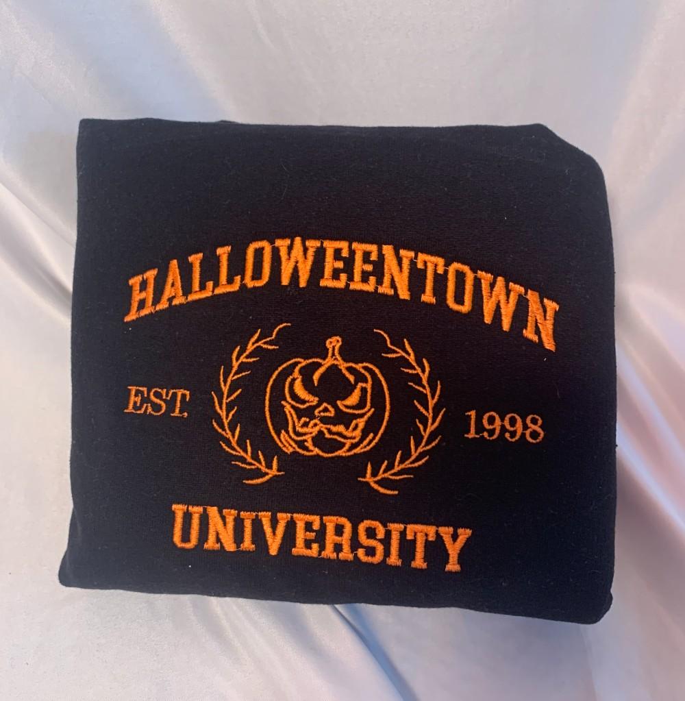 The Halloweentown Uni Embroidered Crewneck Sweatshirt is the perfect addition to your spooky wardrobe. Made for both men and women, this sweatshirt features a unique Halloweentown design, intricately embroidered for a high-quality finish. With its comfortable fit and soft fabric, it provides ultimate coziness for those chilly autumn nights. Whether you're attending a Halloween party or simply want to show off your love for the holiday, this sweatshirt is a must-have. Stand out from the crowd and embrace the Halloween spirit with our Halloweentown Uni Embroidered Crewneck Sweatshirt. Get yours now and enjoy the value of style, comfort, and Halloween fun!
