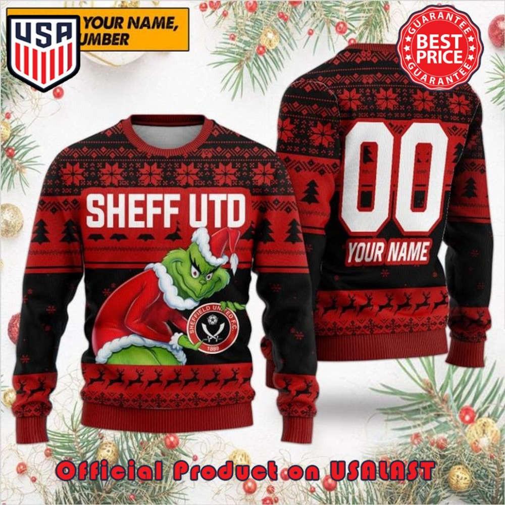 SHEFFIELD UNITED THE GRINCH SANTA HAT WITH LOGO CUSTOM NAME NUMBER UGLY CHRISTMAS SWEATER information: