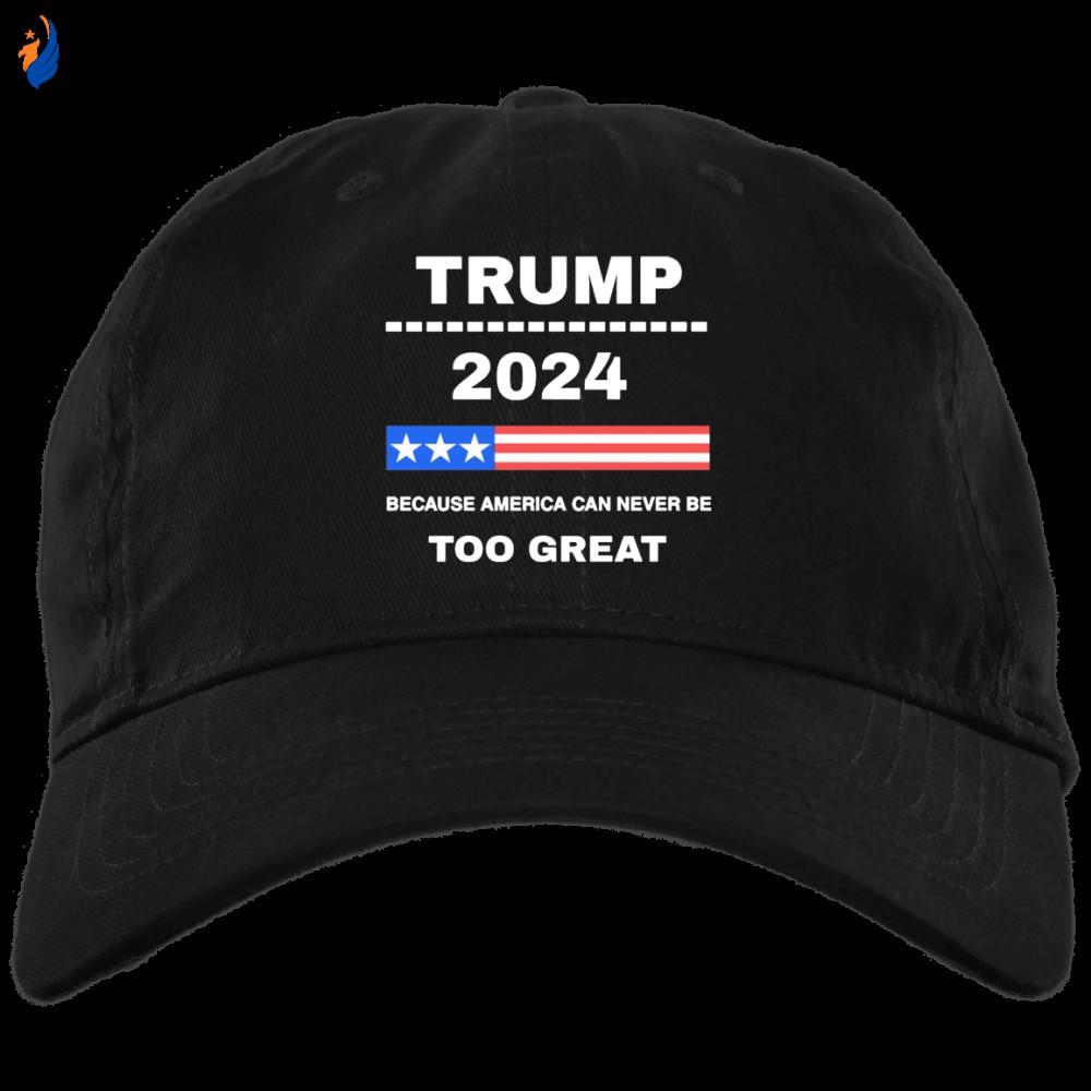 Introducing the Trump 2024 Hat For Sale, a must-have piece of Trump merchandise for all passionate supporters of the campaign. With the slogan "Because America Can Never Be Too Great" boldly embroidered on the front, this classic cap is a symbol of unwavering patriotism and dedication to the values that make America exceptional.