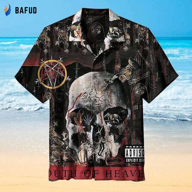 Featuring a vibrant and eye-catching design inspired by the legendary album artwork of Slayer's South Of Heaven, this Hawaiian shirt is a must-have for any music enthusiast. The intricate details and bold colors truly bring the design to life, making it a statement piece that will set you apart from the crowd.