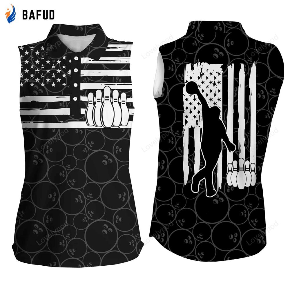 American flag patriotic black bowling pattern bowling Sleeveless polo shirts for women are the perfect blend of style and patriotism. Made with high-quality materials, these shirts feature a striking design that showcases your love for your country and your passion for bowling.