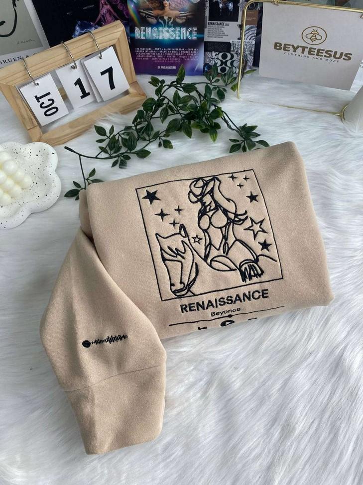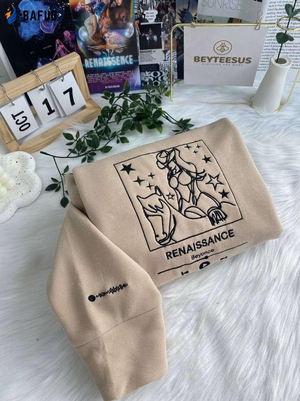 Embroidered Crewneck T-Shirt/Sweatshirt, a must-have for true music enthusiasts. With its intricate embroidery showcasing Beyonce's iconic album, this shirt is a masterpiece in itself. Made from high-quality materials, it offers utmost comfort and durability. Whether you're a man or woman, this shirt is designed to fit perfectly and make a statement. Show your love for Beyonce and her music with this exclusive piece, available only on Spotify. Embrace your inner Renaissance and let your style speak volumes. Get yours today and join the Beyhive!