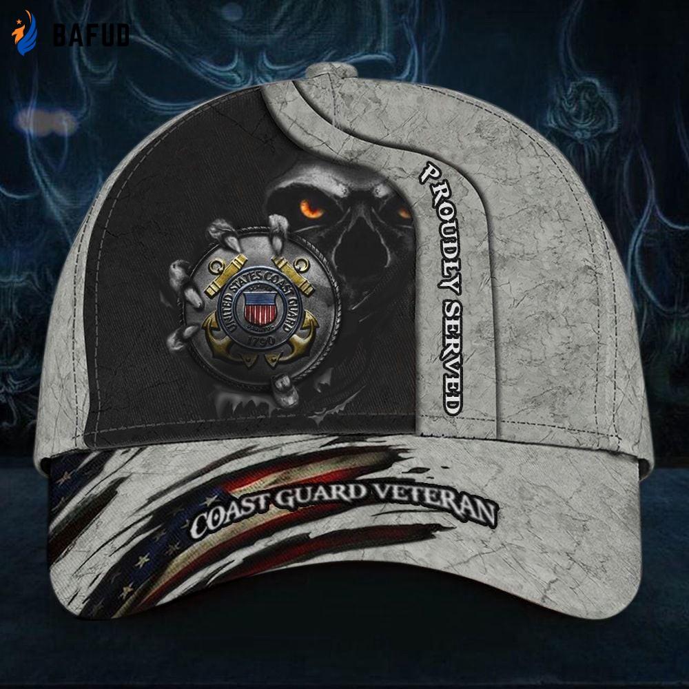 Introducing the Skull Coast Guard Veteran Proudly Served Classic Cap, a must-have accessory for all proud Coast Guard veterans. This premium-quality hat showcases your devotion to the USCG and serves as a perfect retirement gift for those who have selflessly served our nation.