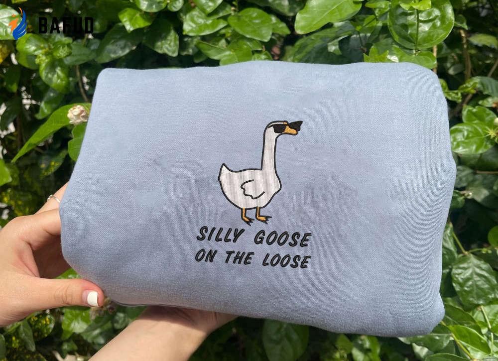 Introducing our Silly Goose On The Loose Embroidered Sweatshirt! This quirky and fun sweatshirt is the perfect addition to your wardrobe. Made from high-quality materials, it offers unrivaled comfort and durability. The unique embroidered design of a silly goose on the loose adds a playful touch to any outfit. Whether you're heading to a casual gathering or lounging at home, this sweatshirt is sure to turn heads and spark conversations. Plus, it makes a fantastic birthday gift for your loved ones! What's more, this shirt is gluten-free, ensuring that it meets the needs of individuals with dietary restrictions. Stand out from the crowd with our Silly Goose Shirt and show off your sense of humor. Don't miss out on this hilarious and stylish piece – order yours today!