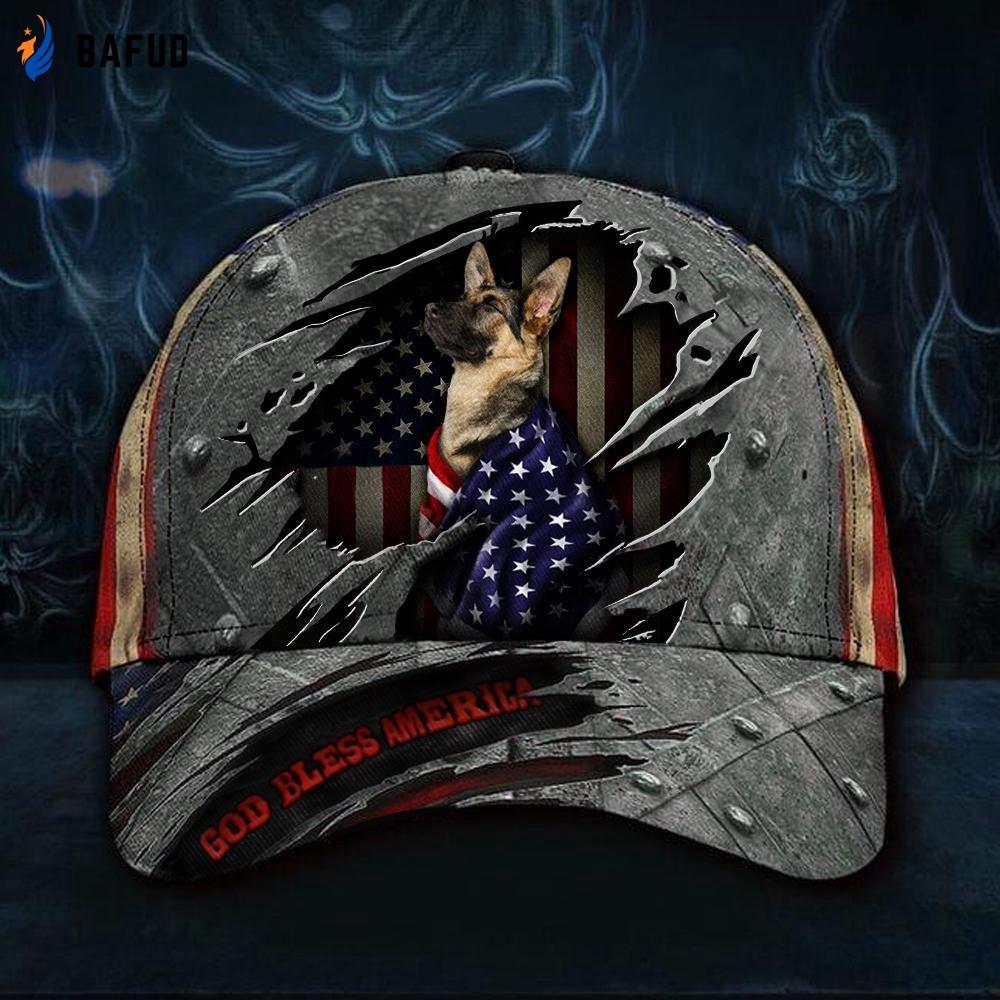 This German Shepherd God Bless America Cap is a true embodiment of patriotism, style, and comfort. Join us in celebrating the spirit of America with this exclusive accessory. Order now and let your love for the German Shepherd and the USA shine bright this Independence Day 2021!