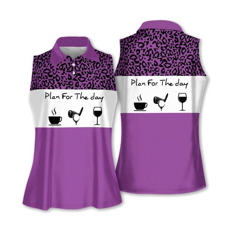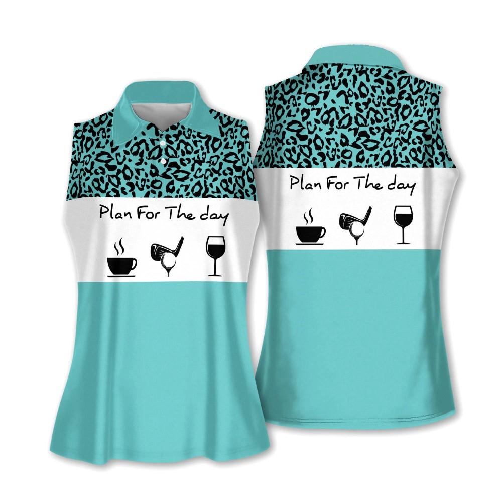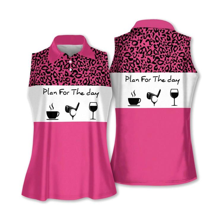 Golf And Wine Women Sleeveless Athleisure Polo Shirt, Plan For The Day Leopard Multicolor Sleeveless Polo Shirt - Gift For Mother's Day, Golfers