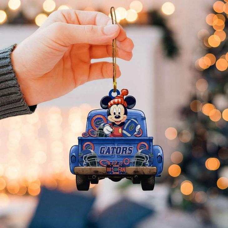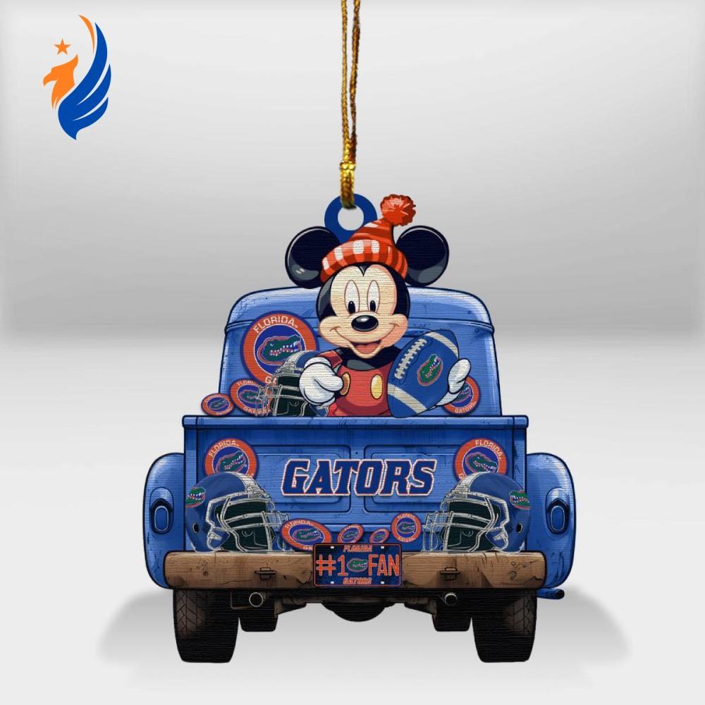 Mickey Mouse Christmas Wood Ornament. Made from highquality wood, this ornament features the iconic Mickey Mouse dressed in a Florida Gators outfit, showcasing your team pride in a festive way.
