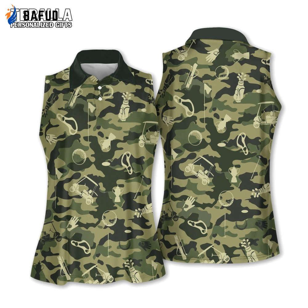 Introducing our Green Camouflage Golf Set for Women, featuring a Short Sleeve Polo Shirt and a Sleeveless Polo Shirt Sport. Designed for both style and performance, this set is perfect for the fashionable golfer who wants to make a statement on the course.