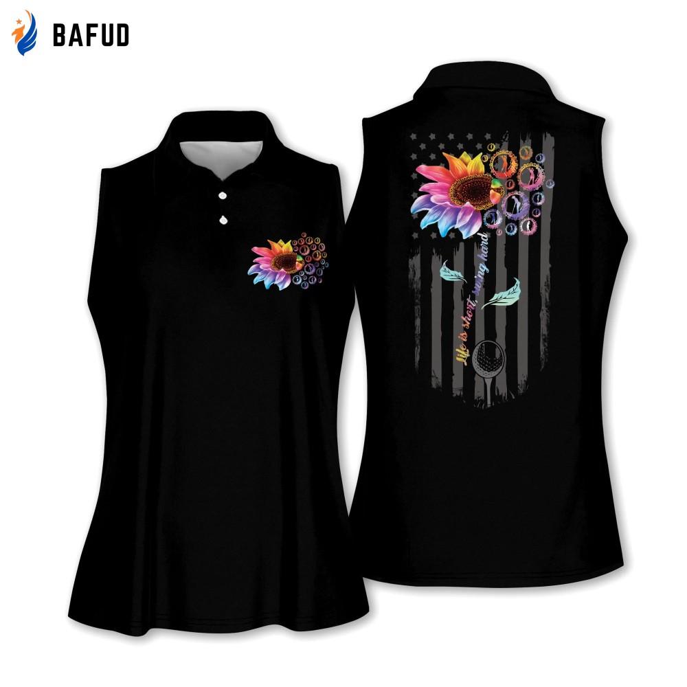 Introducing our Golf Women Sleeveless Athleisure Polo Shirt, a perfect blend of style and functionality. This Life Is Short, Swing Hard Sunflower American Flag Polo Shirt is the ideal gift for Mother's Day, golfers, and all the wonderful females out there. Crafted with meticulous attention to detail, this polo shirt will elevate your golfing experience.