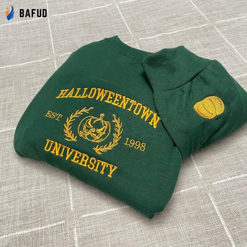 Introducing our Halloweentown University Embroidered Crewneck T-Shirt, the perfect spooky attire for both men and women. Made from premium quality fabric, this sweatshirt offers ultimate comfort and style. With its detailed embroidery and vibrant colors, you'll stand out in any Halloween party. Whether you're a die-hard fan of the classic movie or simply love the eerie aesthetics, this shirt is a must-have. It's not just a piece of clothing, it's a statement of your love for all things spooky. Embrace the spirit of Halloweentown and show off your unique sense of style with our exclusive sweatshirt. Order now and become a part of the Halloweentown University family!