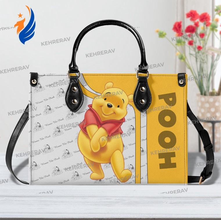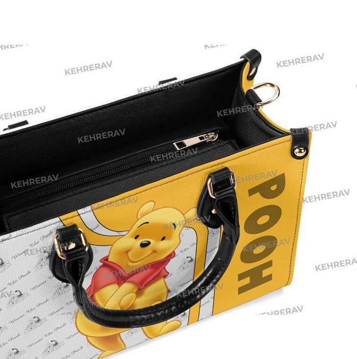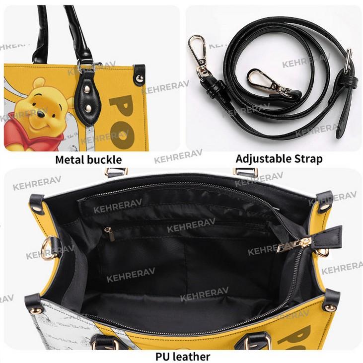 Introducing the Lovely Winnie The Pooh Leather Handbag, a must-have for all Pooh lovers! This exquisite handbag is meticulously crafted from high-quality leather, ensuring durability and long-lasting beauty. Its spacious interior allows you to effortlessly organize your essentials, while the stylish design adds a touch of elegance to any outfit. With its adjustable strap, it can be worn as a shoulder bag or across the body, providing versatility and comfort. Handmade with love, this custom leather bag showcases your unique style and passion for the beloved Pooh character. Perfect for women who appreciate both fashion and functionality, this Pooh Lover's Handbag is a true statement piece that effortlessly brings joy to your everyday life. Don't miss out on this one-of-a-kind accessory that combines timeless charm and practicality. Treat yourself or surprise a loved one with this exceptional Woman Handbag that is sure to turn heads and spark conversations wherever you go. Experience the value of owning a handmade bag that not only complements your personal style but also celebrates your love for the delightful world of Winnie The Pooh. Due to the different monitor and light effects, the actual color of the item might be slightly different from the visual pictures. The leather bag. This item is a must-have for any woman, suitable from workday to the weekend outing. It is roomy and comfortable to carry, thanks to its shoulder straps and rolled leather top handles. Fashioned from supple-grained leather printed on both sides, creating a stylish contrast in color.