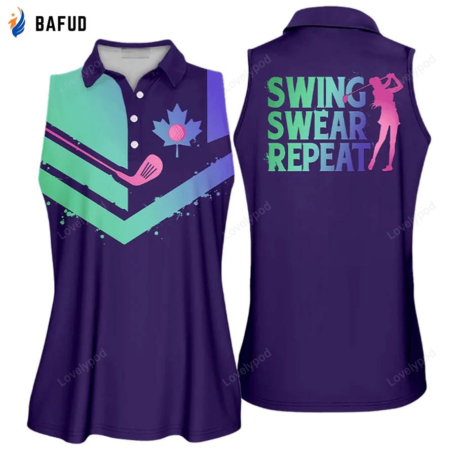 Featuring a striking gradient design, this shirt showcases the iconic "Swing Swear Repeat" motto alongside the flag of Canada, proudly representing your love for the game and your country. The color sleeveless design adds a modern and trendy touch, allowing for unrestricted movement and maximum comfort during every swing.