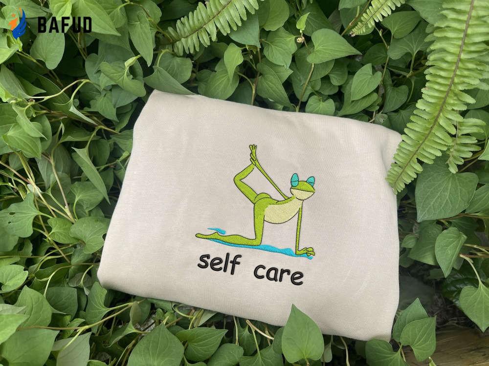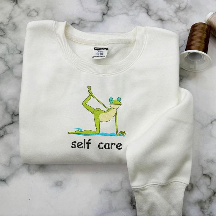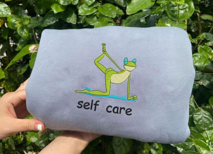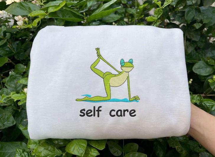 Introducing our Self Care Frog Embroidered Sweatshirt, the perfect addition to your cozy wardrobe! Made from premium quality fabric, this sweatshirt features a cute and vibrant embroidery of a frog doing yoga, adding a touch of whimsy to your everyday look.