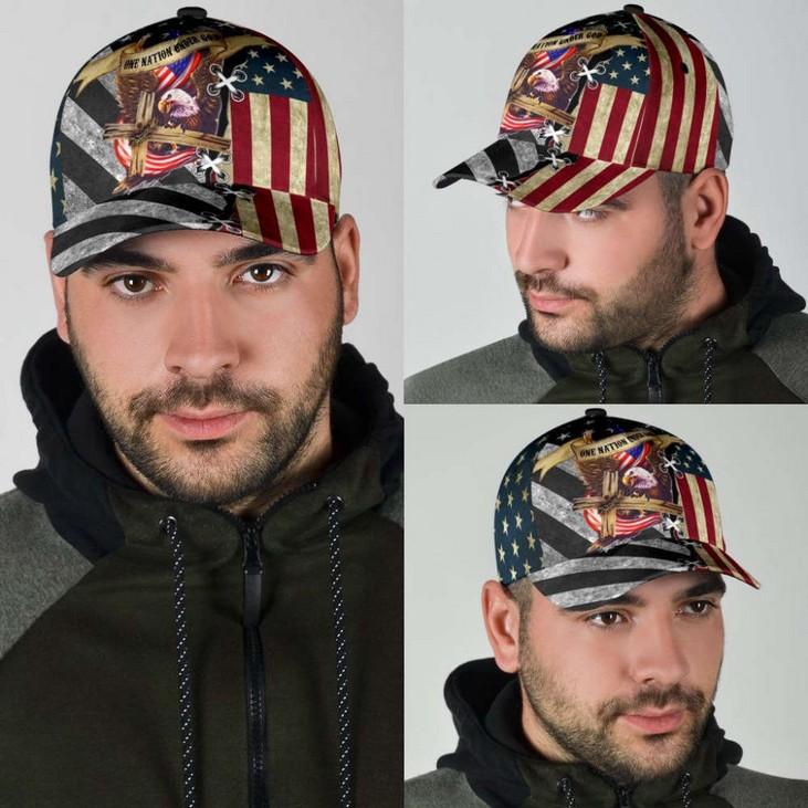 Join the movement and proudly display your faith and love for our nation with our Jesus One Nation Under God American Flag Classic Cap All Over Print. Order yours today and let your headwear become a testament to your unwavering commitment to both Jesus and America!