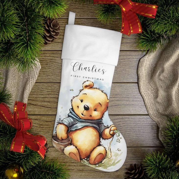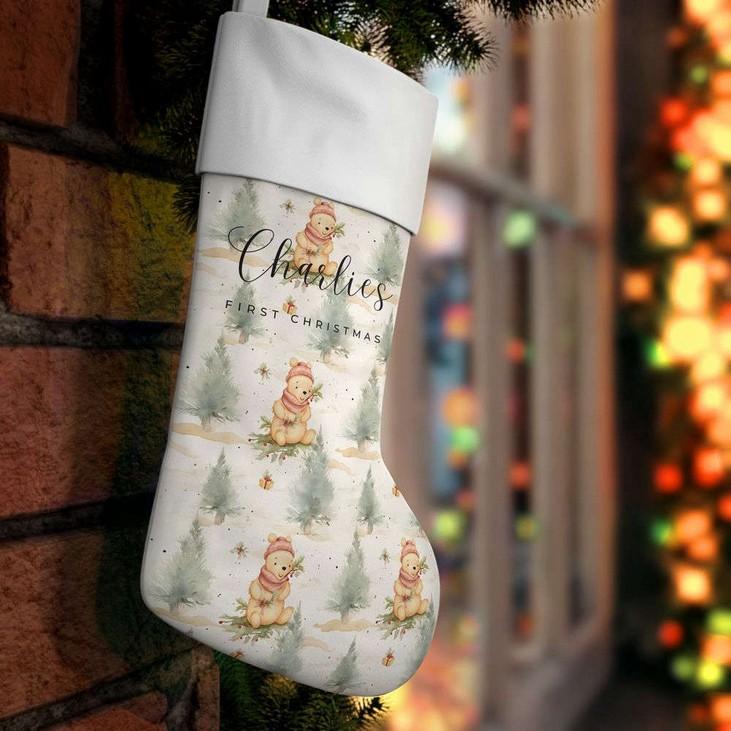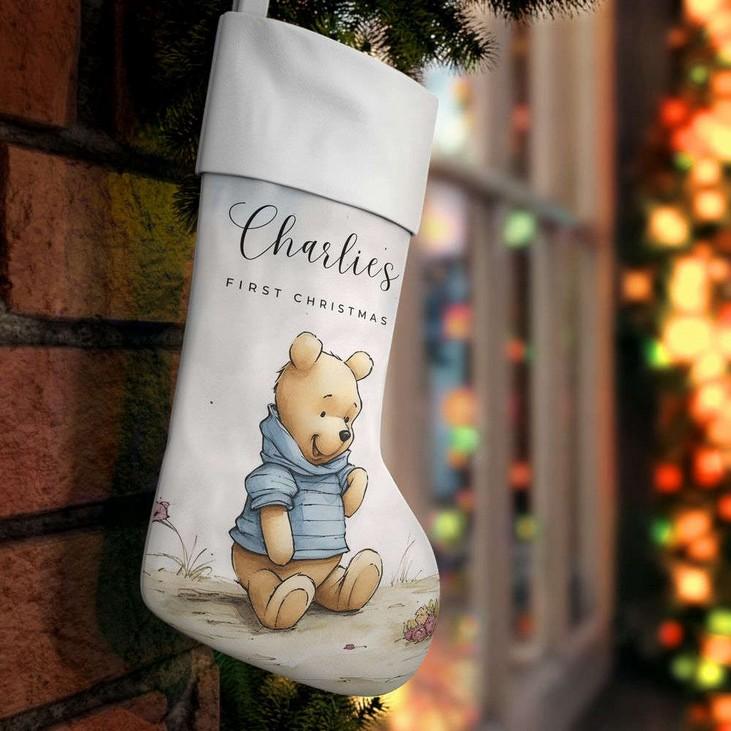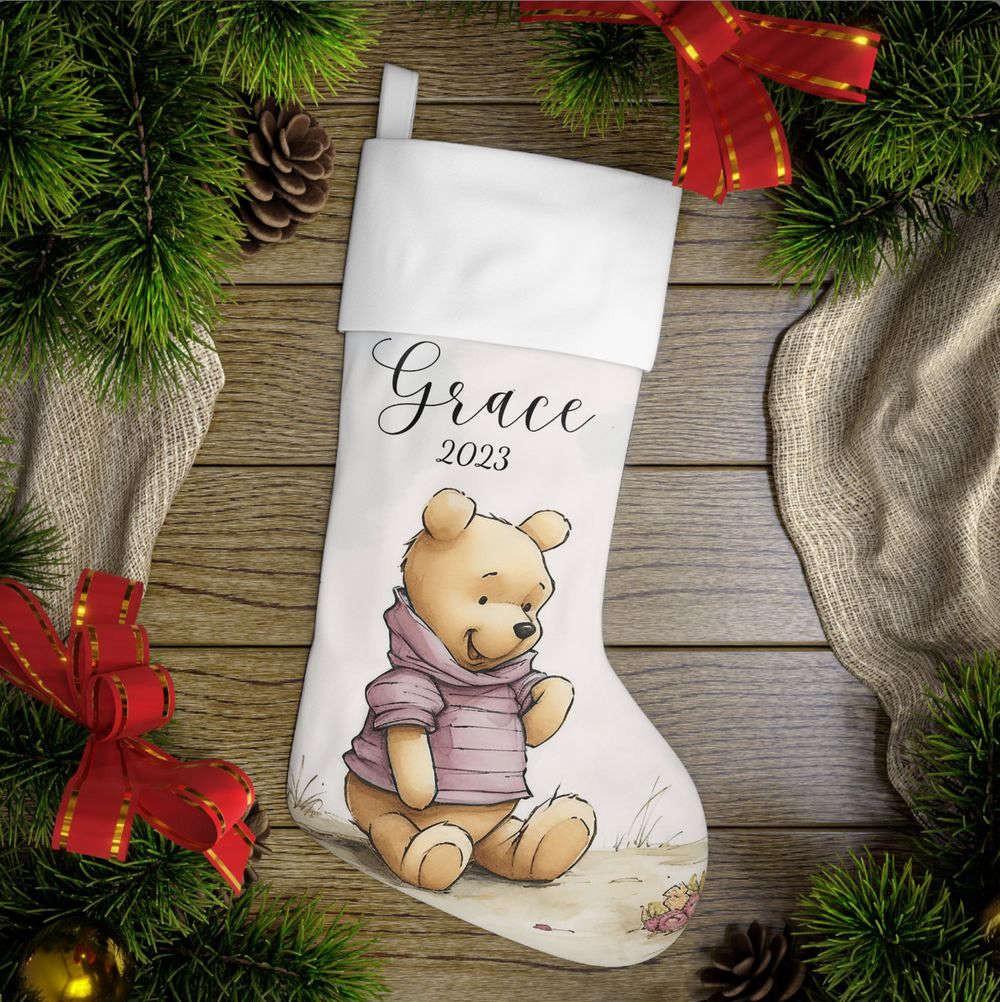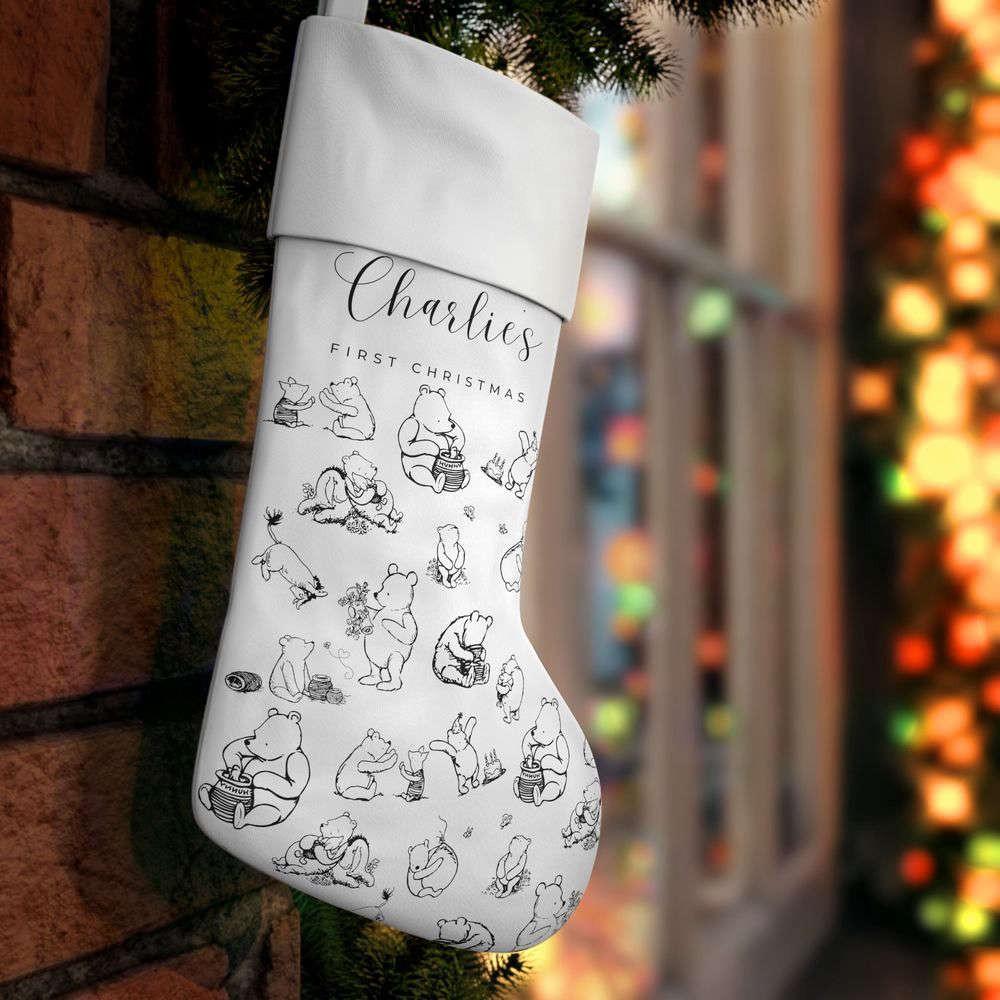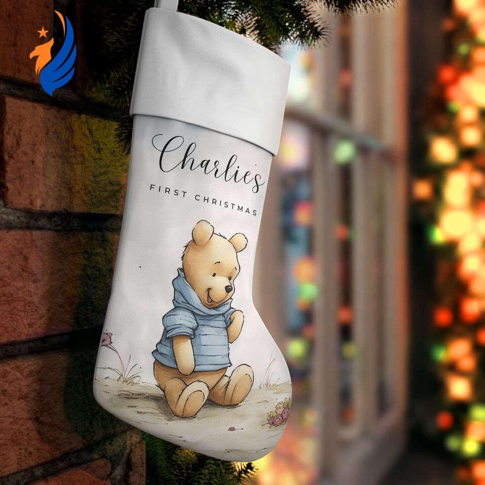Introducing our charming Personalized Christmas StockingWinnie the Pooh Baby First Christmas! Celebrate your little one's first Christmas in style with this adorable stocking featuring everyone's favorite bear, Winnie the Pooh. Made from highquality materials, this stocking is expertly embroidered with your baby's name for a personal touch. Hang it by the fireplace or on the bedpost to create a festive atmosphere. The soft and spacious design can hold a variety of goodies, making it perfect for Santa's surprises. This stocking not only adds a touch of Disney magic to your holiday decor but also becomes a cherished keepsake for years to come. Make your baby's first Christmas truly memorable with our Personalized Christmas Stocking - Winnie the Pooh Baby First Christmas!