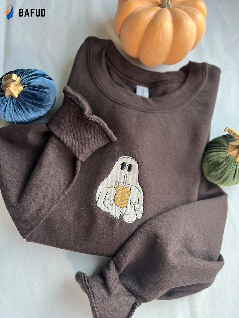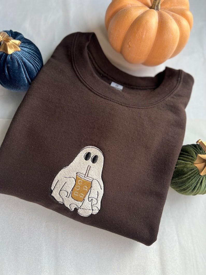 Ghost With Coffee Embroidered Crewneck T-Shirt, Sweatshirt for Men Women Sweatshirt, Gift for Men Women