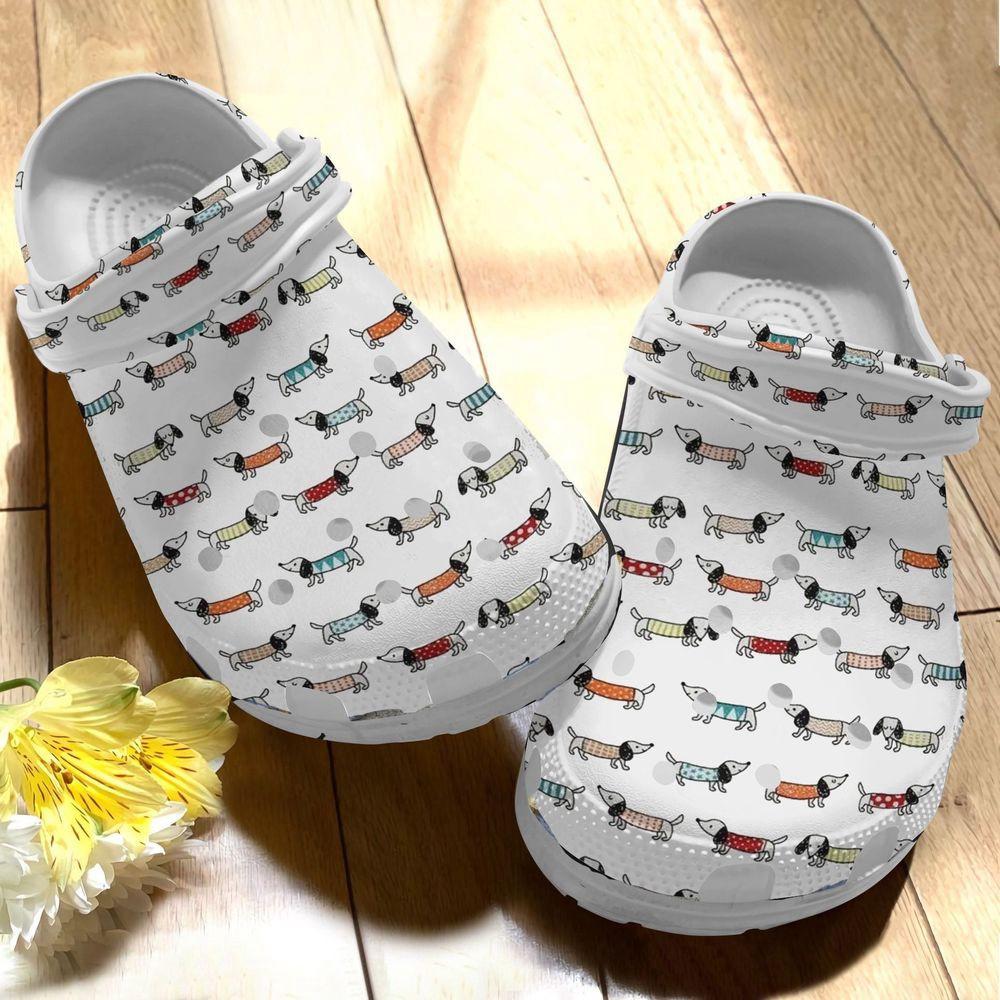 The Dachshund Clog Lovely Dachshund Crocs Crocband Clog is a must-have for all dog lovers! Available in 5 vibrant colors, these clogs are not only stylish but also comfortable. Made with Croslite™ foam, they provide all-day cushioning and support. The contoured footbed and adjustable heel strap ensure a secure fit. With their non-marking and odor-resistant qualities, these clogs are perfect for indoor and outdoor wear. Show off your love for Dachshunds while enjoying the comfort and durability of these Crocs. Get yours today and step out in style!