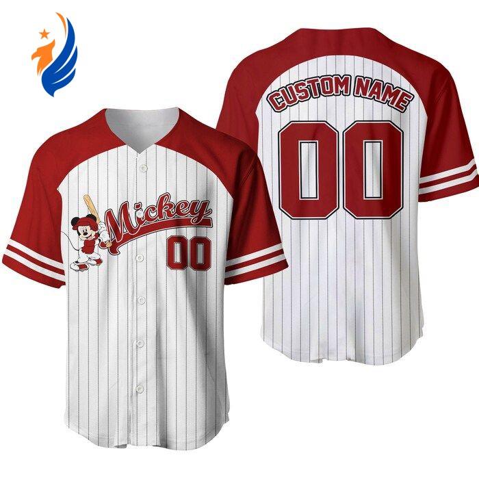 But that's not all! This jersey is not just about style; it's about quality too. With careful attention to detail, it is expertly crafted to deliver durability and long-lasting performance. Whether you're heading to a theme park or simply want to elevate your fashion game, this Mickey Mouse Custom Striped White Red Disney Unisex Cartoon Graphic Casual Outfits Custom Baseball Jersey is the perfect addition to your wardrobe. Join the Disney fan club and make a statement with this musthave jersey today. Get ready to turn heads and embrace the magic of Mickey Mouse like never before!